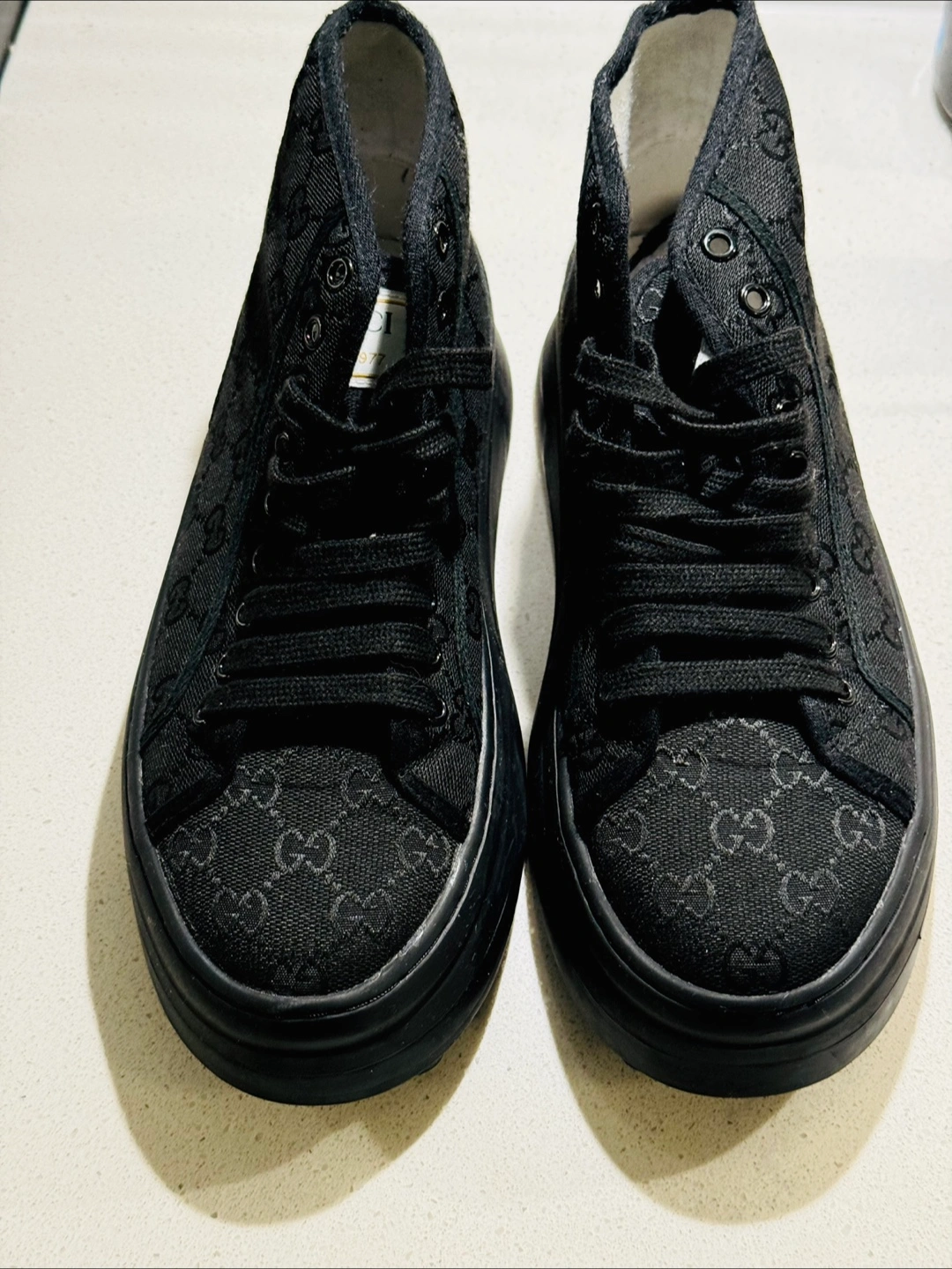 High-top sneakers. Black colour. Features a monogram pattern. Would be great for everyday wear, knowing you can always feel comfortable in them.