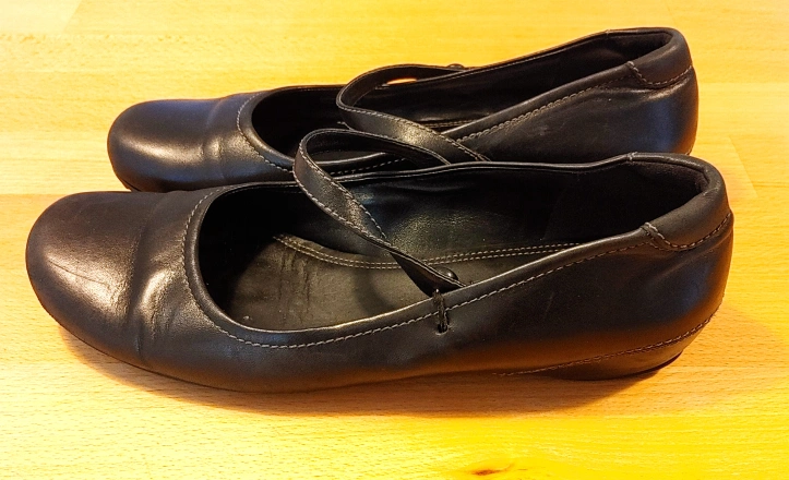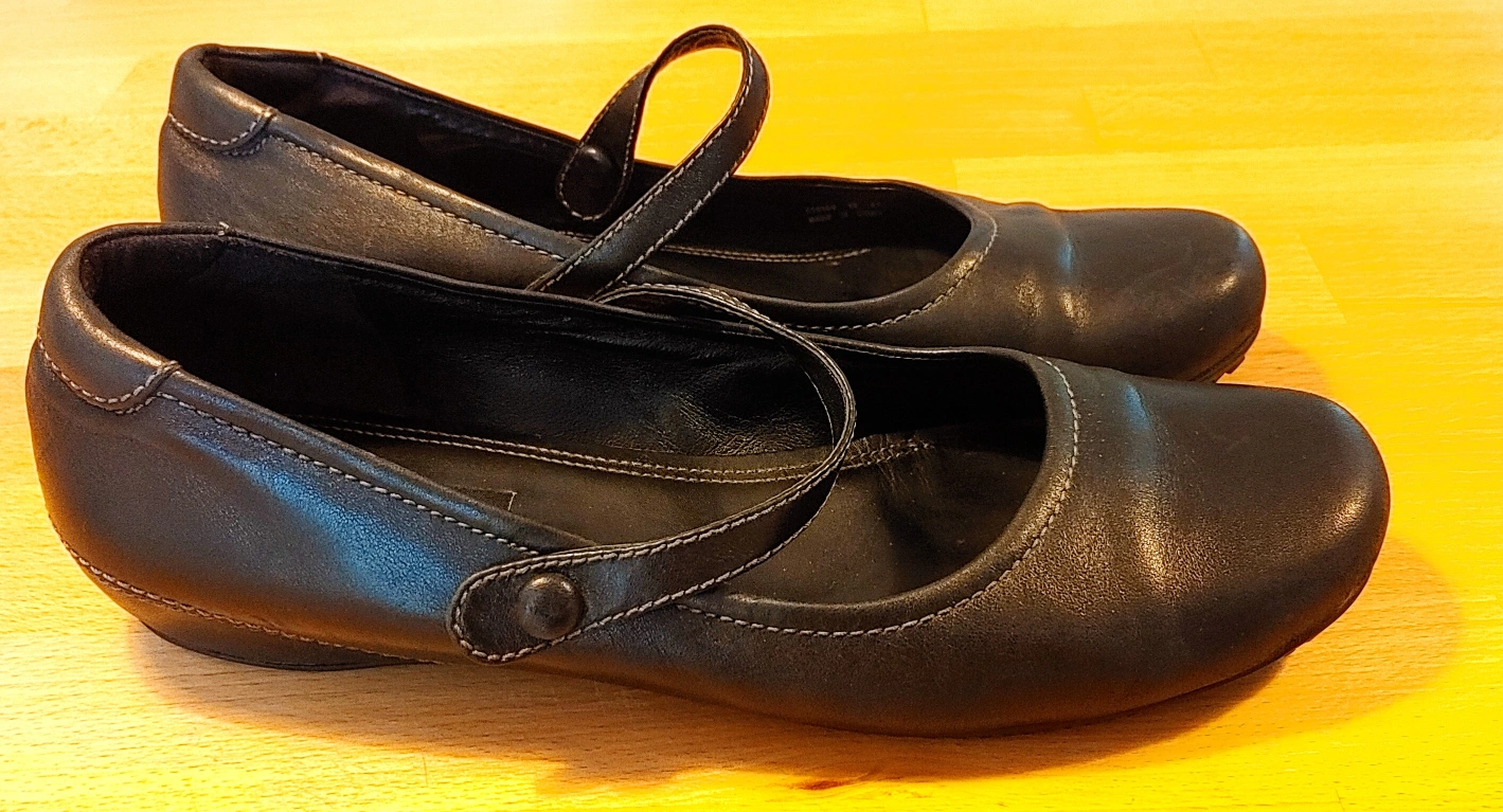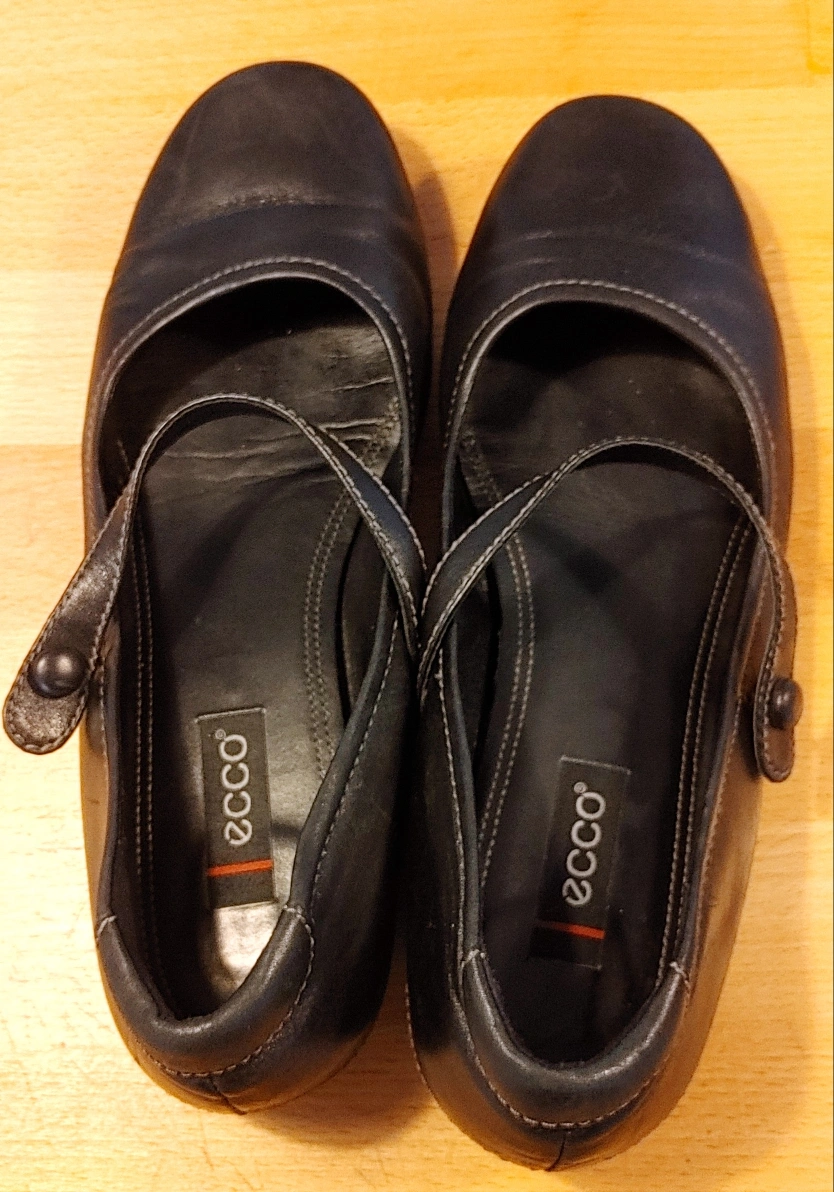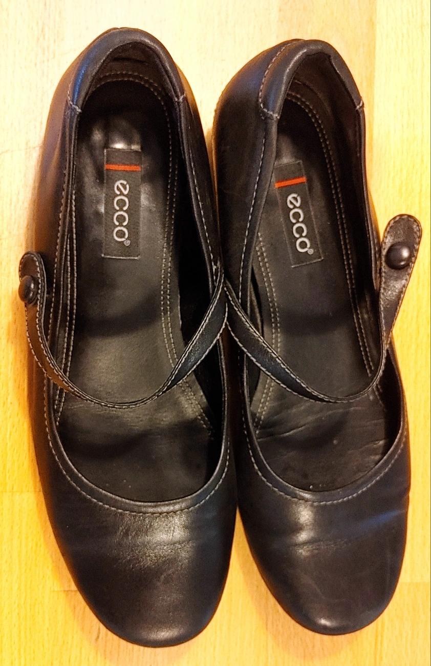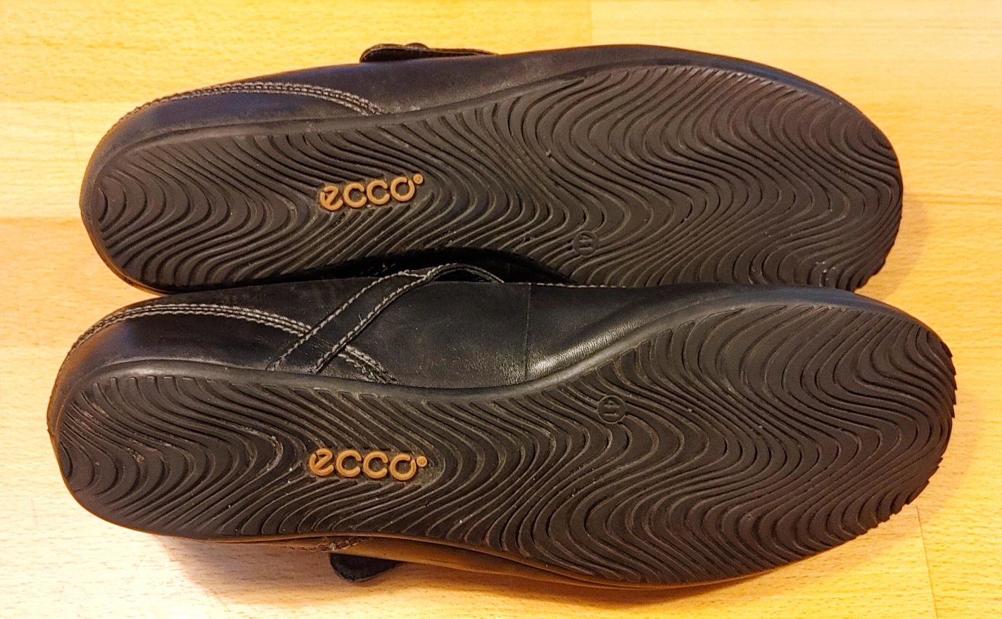 Women's black leather Ecco flats with rounded toe. Straps across the foot, that button on the side. Detailed with white stitching. Shoes in good condition. Thoroughly cleaned and disinfected. Smoke free home pick up Mt.Brydges cash only.