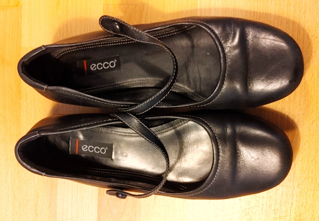 Women's black leather Ecco flats with rounded toe. Straps across the foot, that button on the side. Detailed with white stitching. Shoes in good condition. Thoroughly cleaned and disinfected. Smoke free home pick up Mt.Brydges cash only.