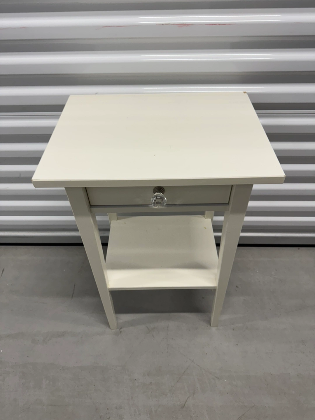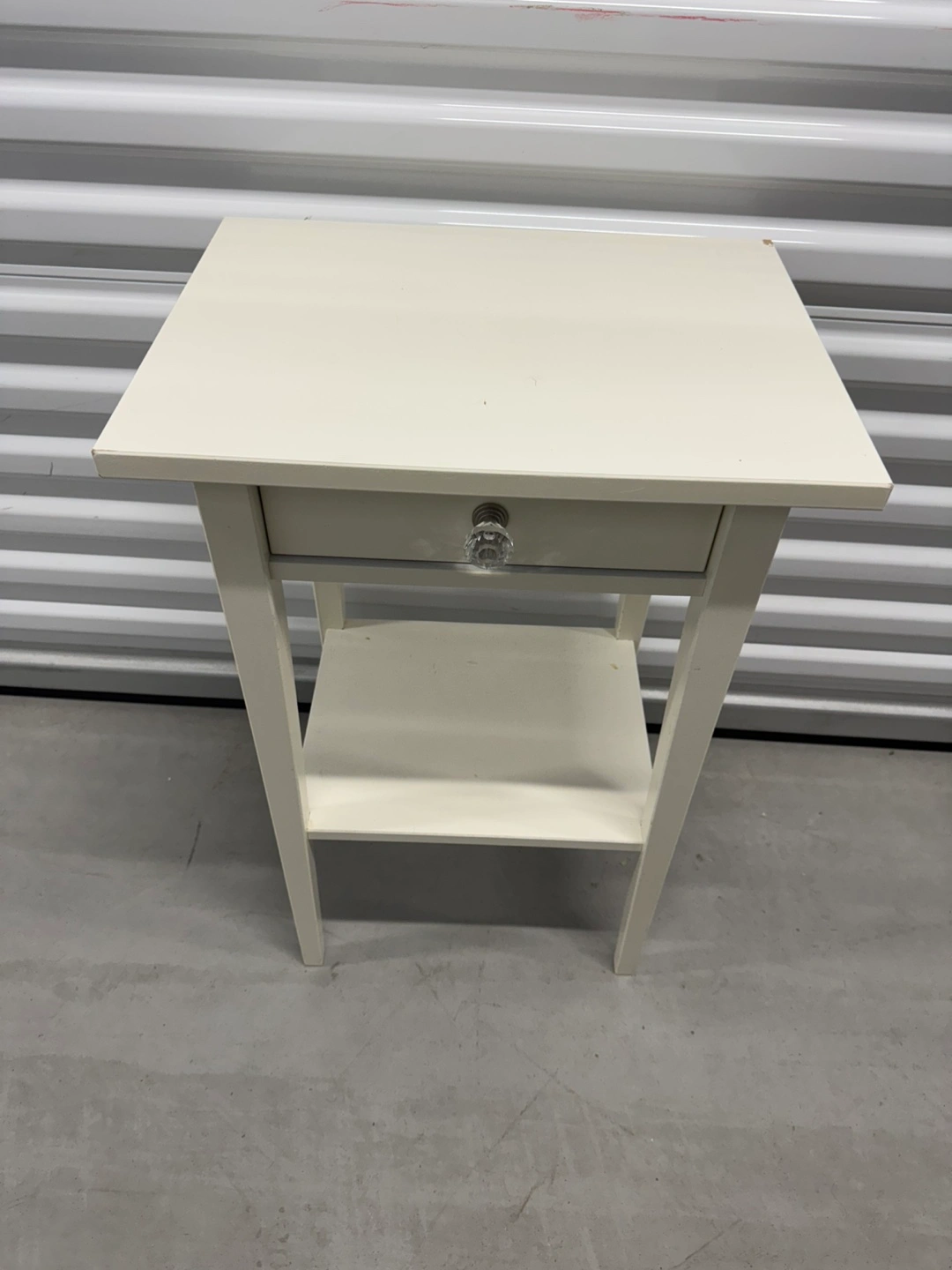 Small white table. One drawer. A crystal knob on the drawer. A shelf below the drawer. This table is perfect for placing your favourite books and a warm cup of tea.