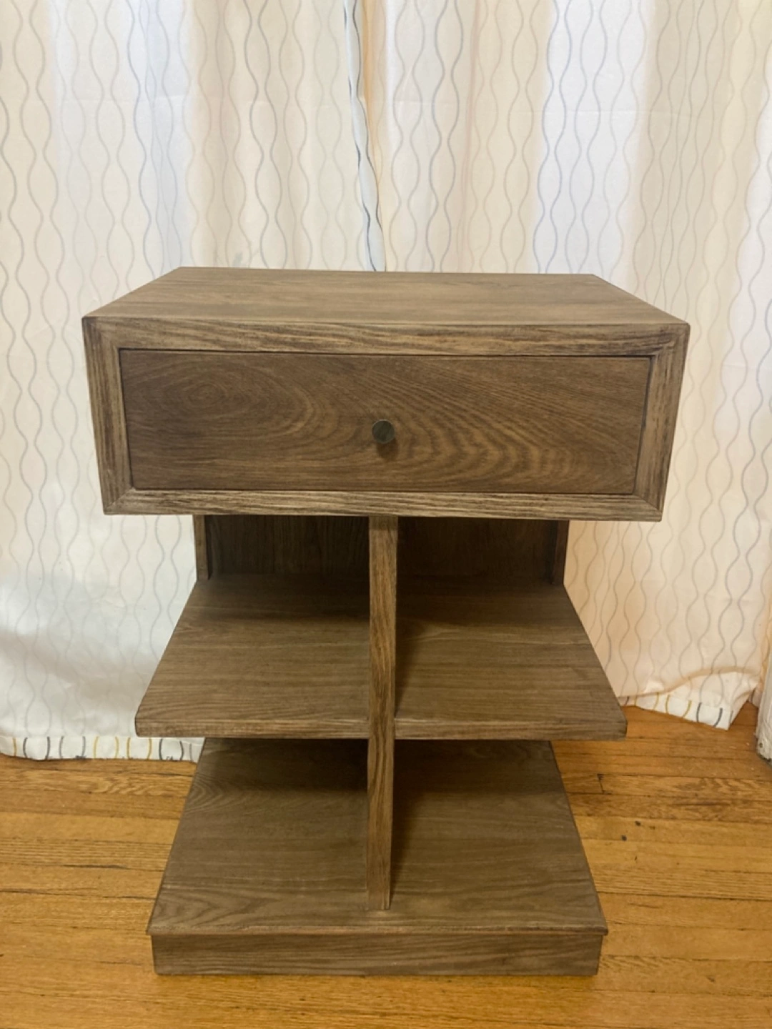 A side table with a single drawer. Features multiple shelves. Made of wood. The drawer has a round knob. You could place a lamp on top and read before bed.
