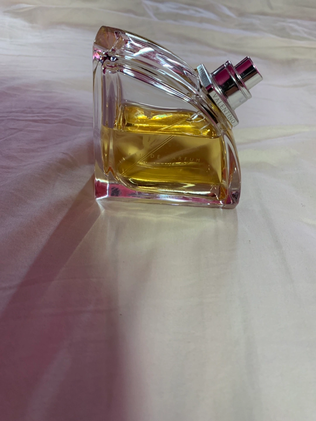 A beautiful perfume bottle. Clear glass with a silver cap. The bottle has a unique shape. Applying this perfume to yourself can be a relaxing end to your day.