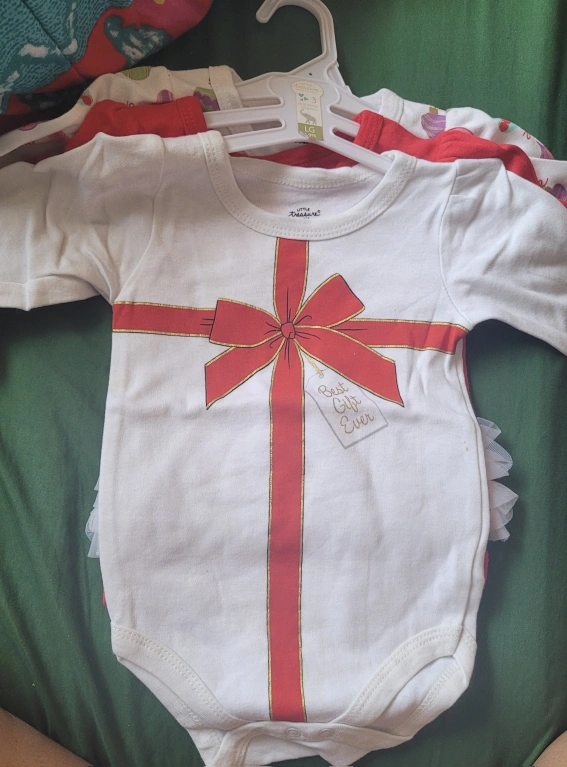 Size 6-9 months 3 piece Christmas themed set. Merry Glitzmas piece comes with attached tutu frill, some prints have added shine and sparkle. Pickup at Greenwood and Danforth. SFPF home. X posted. Please check my other listings to bundle with more cool stuff.