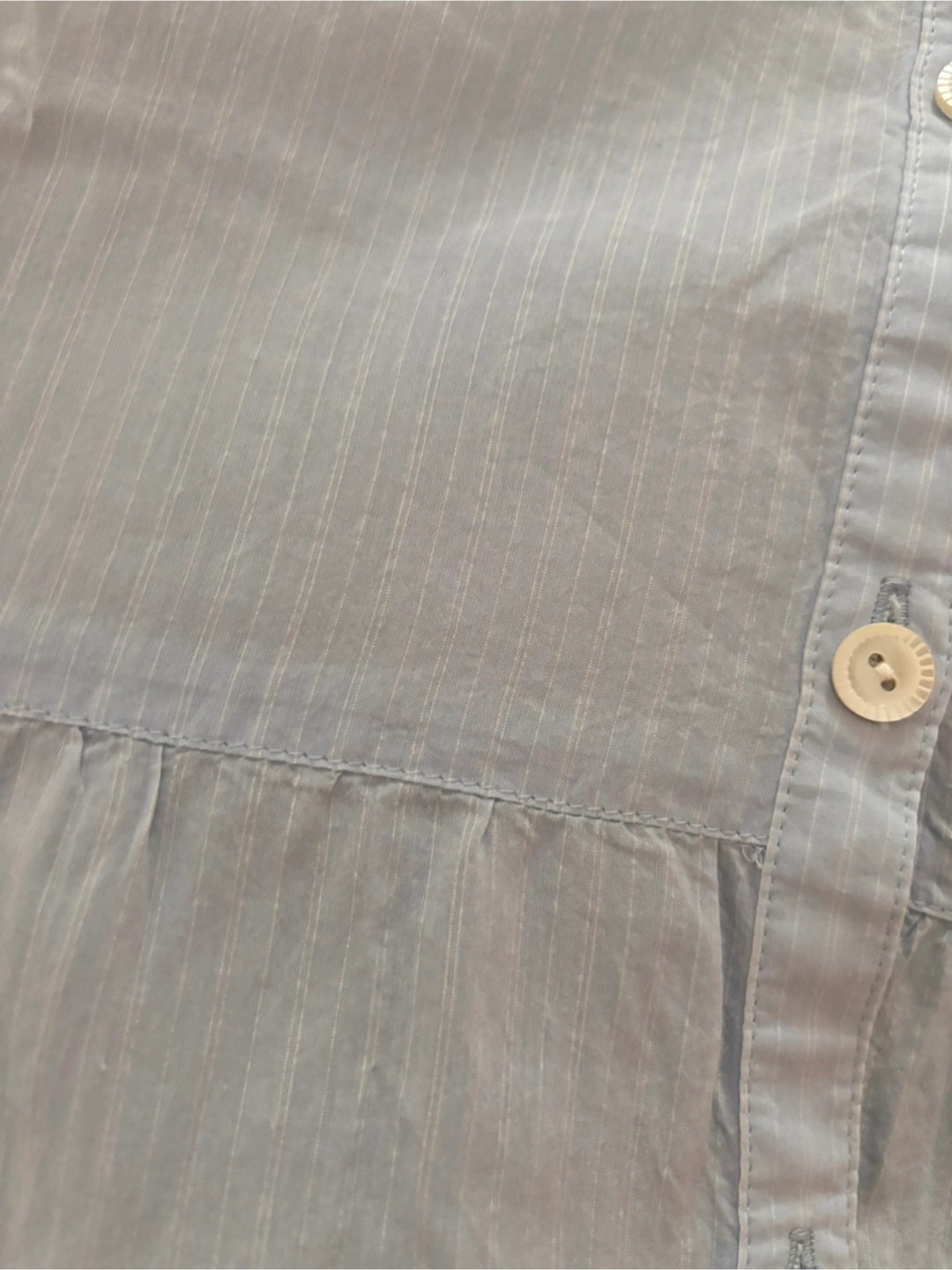 Light blue, yarn-dyed stripes, long sleeve button-up. The shirt features a band collar and a tiered design. The shirt has a slightly longer back hem. Silk cotton blended. This shirt is perfect to relax in on a sunny afternoon.