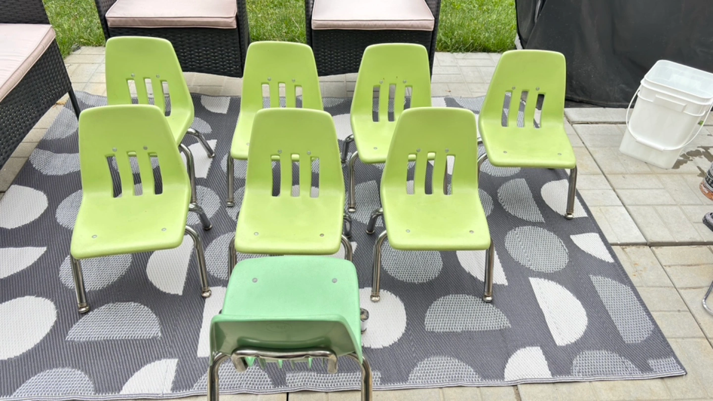 Selling a set of eight green chairs. They feature a seat and backrest made of plastic. The chairs have a chrome-coloured metal frame. Perfect for sitting outdoors or indoors and enjoying a quiet moment. Amazing for a home daycare or house with kiddos .
