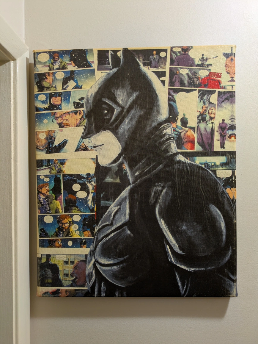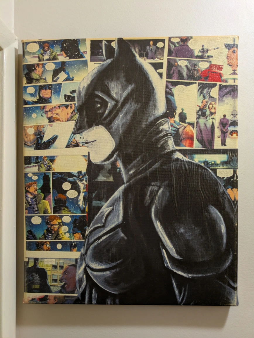 Batman canvas art. Featuring the caped crusader. A striking piece, it would make a great addition to any room for a fan, making you feel relaxed and inspired. Showcases a comic book background.
