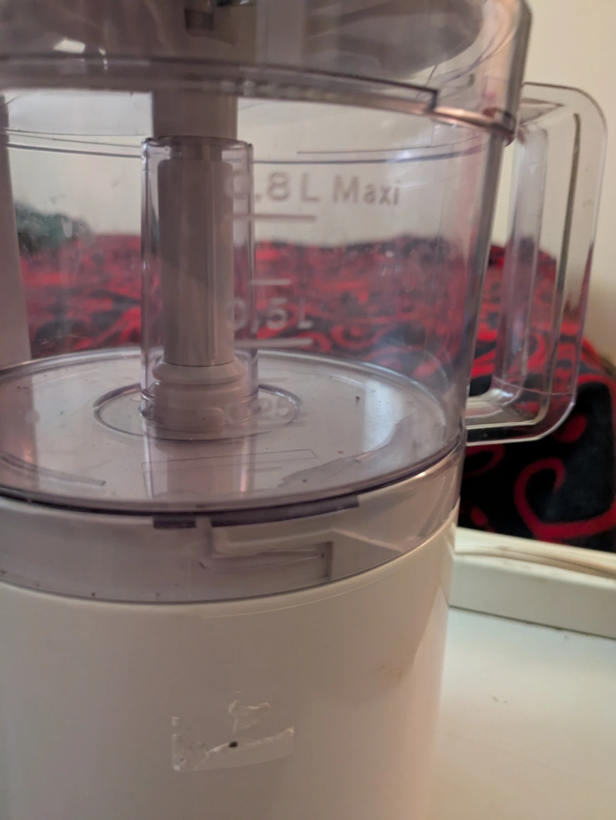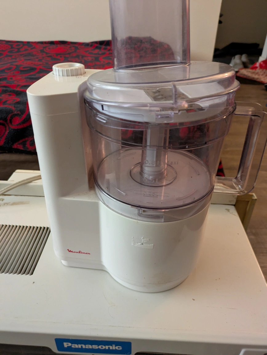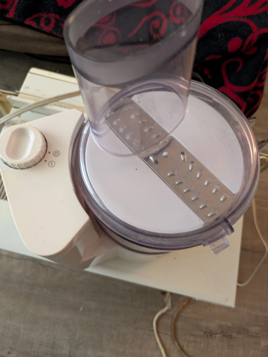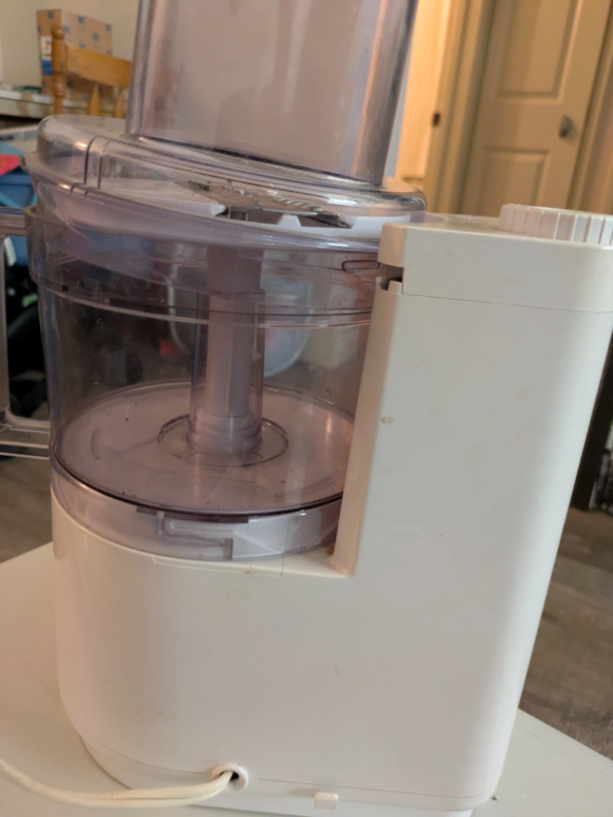 Food processor with white and clear plastic components. Contains a control dial and a food chute. Great for quickly prepping your favorite ingredients for a nice meal.