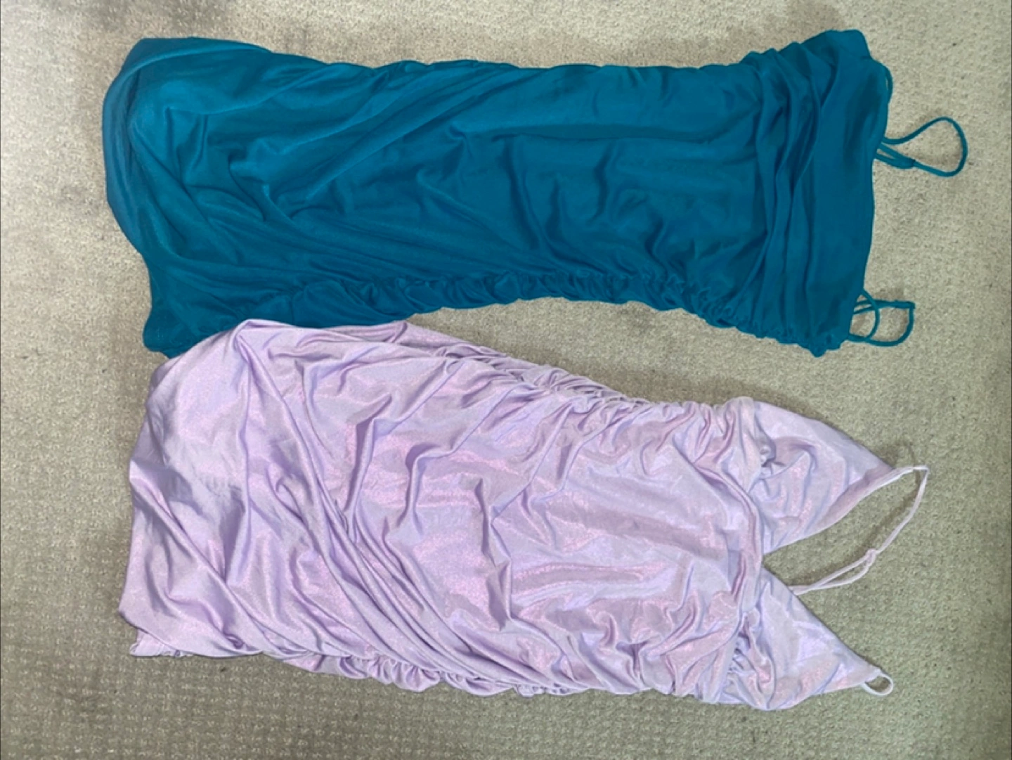 34Selling these two dresses. Both are sleeveless with spaghetti straps. One is teal, and the other is a light purple and shimmery You could wear these dresses for a night out.