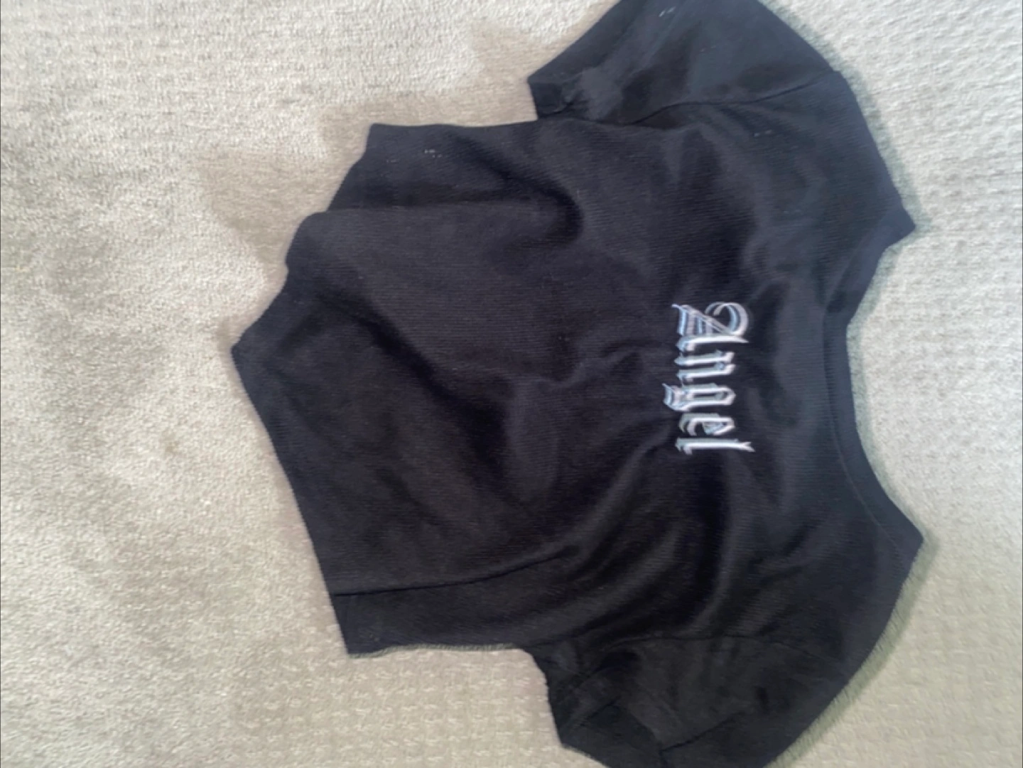 34Black short-sleeved crop top. Features the word "Angel" embroidered on the front. Perfect for a comfy night in.