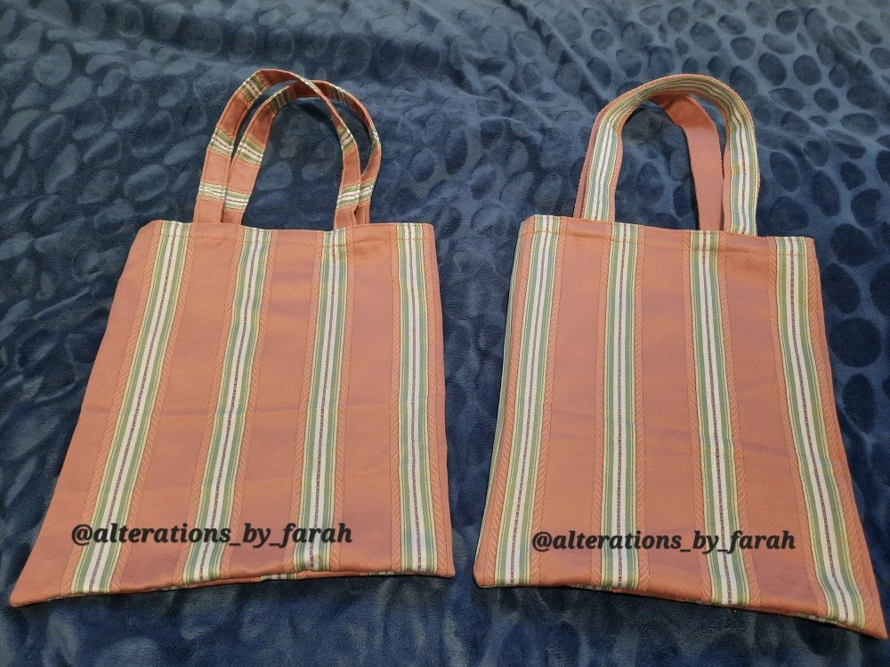 The bag is made from a thick and light fabric with vertical stripes, and the handles are a matching peach colour. This bag is perfect for daily use and also as a gift.
