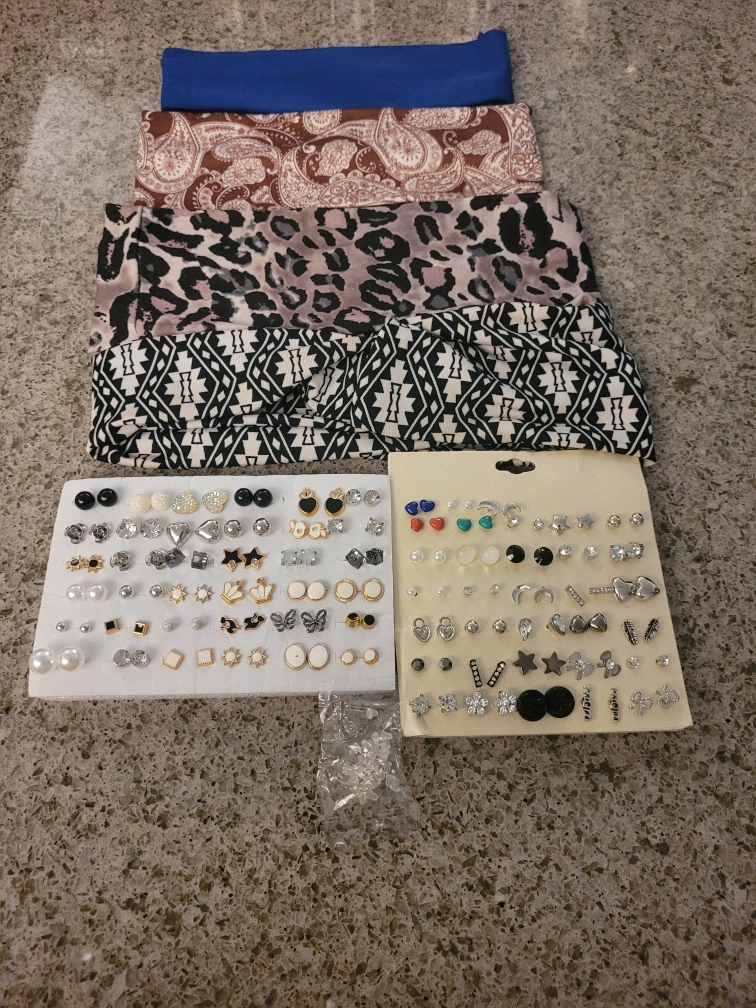 TWO display cards of earrings and a few headbands. The earrings are BRAND NEW !!! Headbands appear to have different patterns in very good condition.WASHED ! These items can be used to add a pop of flair to any outfit.
