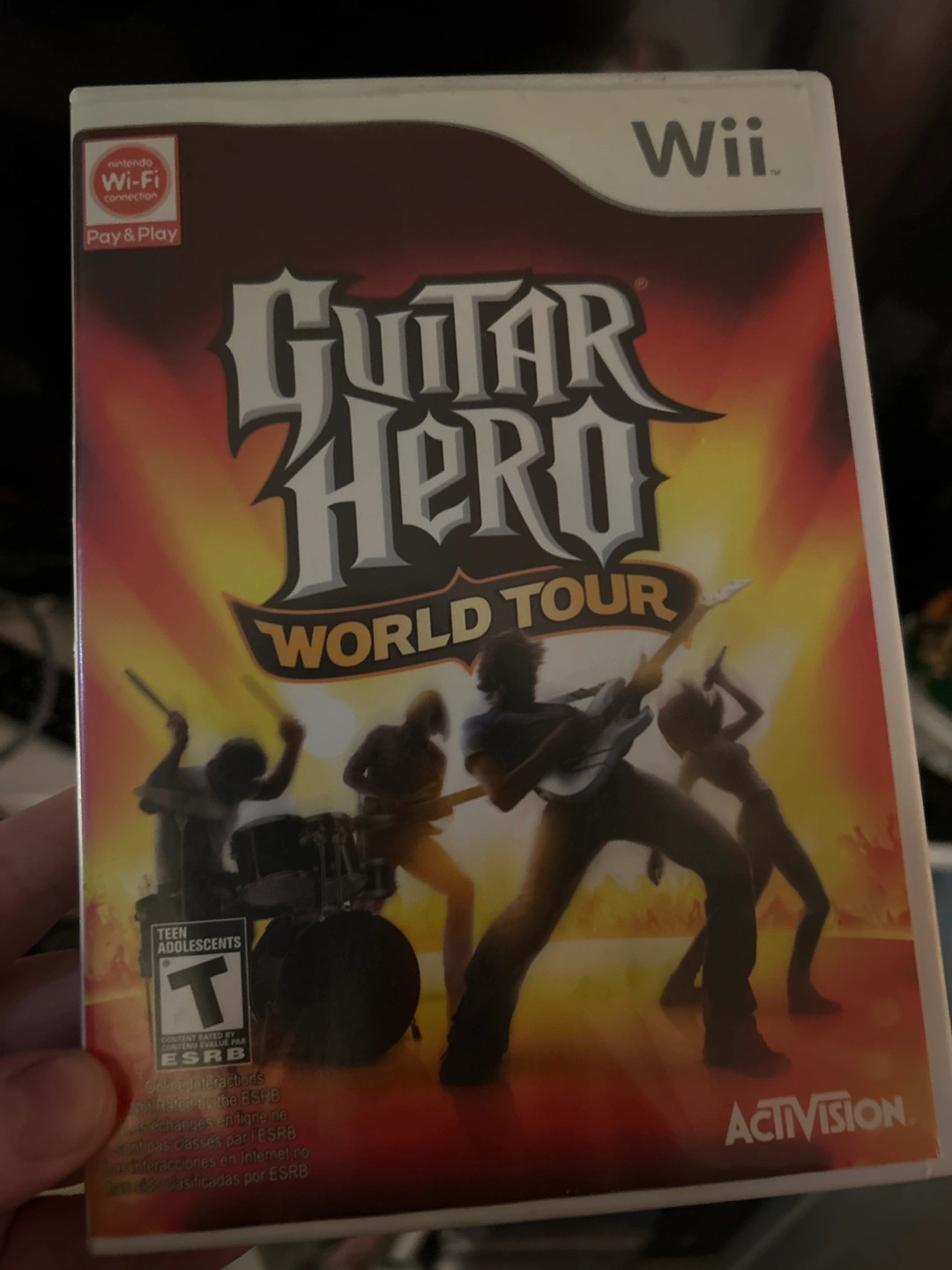 Here's a copy of Guitar Hero World Tour for the Nintendo Wii console. A classic rhythm game featuring various instruments. It's perfect for unwinding after a long day. It comes with a case, no instruction manual.