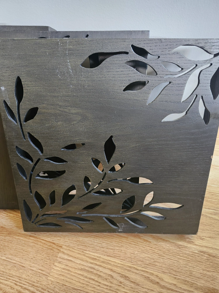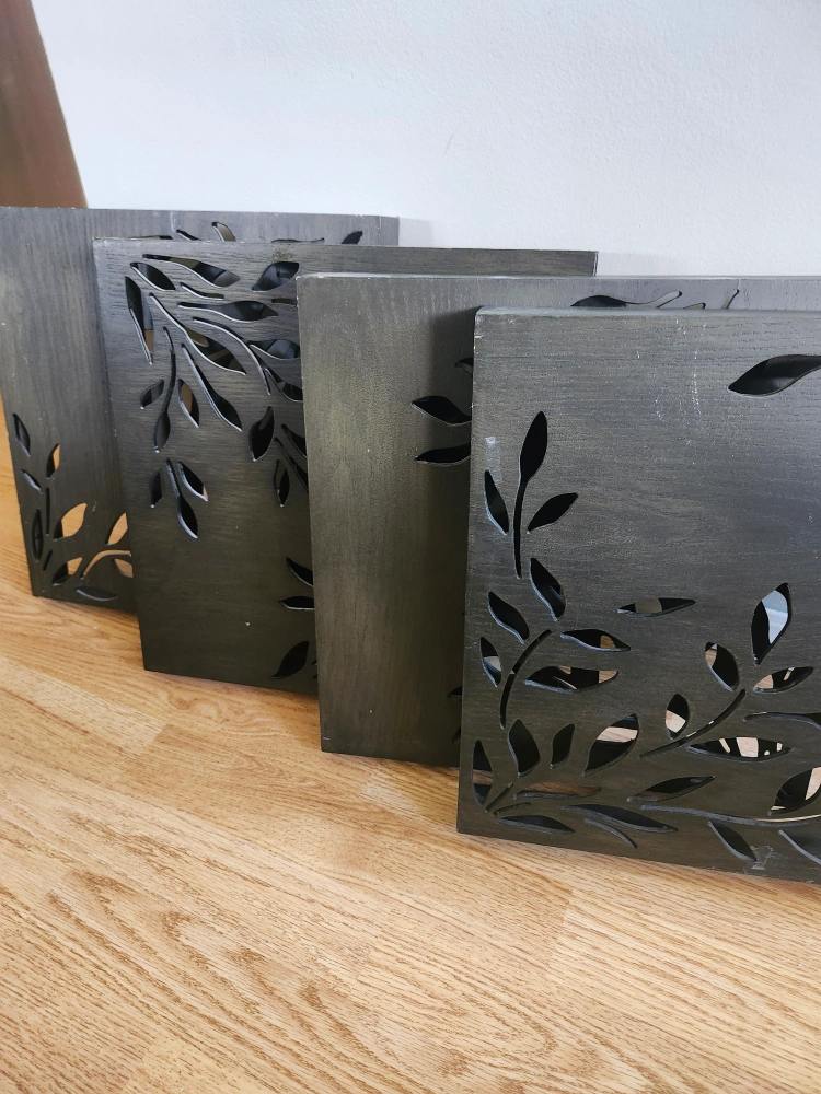 These wooden panels feature a leaf design. Finished in a dark brown/black and light and ready to hang. Great for bringing a touch of nature indoors, creating a serene atmosphere in your space.