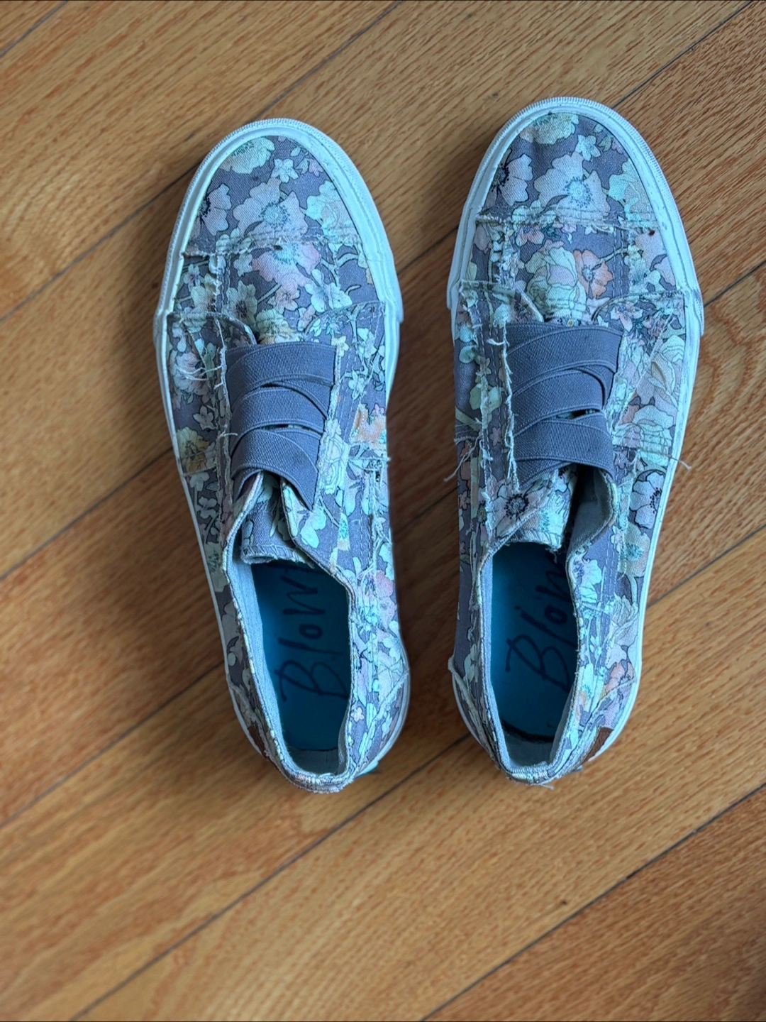 Floral print slip-on sneakers. Features elastic bands across the top. White rubber soles. Perfect for a relaxing walk in the park.