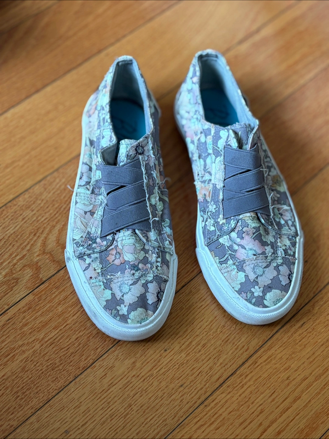 Floral print slip-on sneakers. Features elastic bands across the top. White rubber soles. Perfect for a relaxing walk in the park.