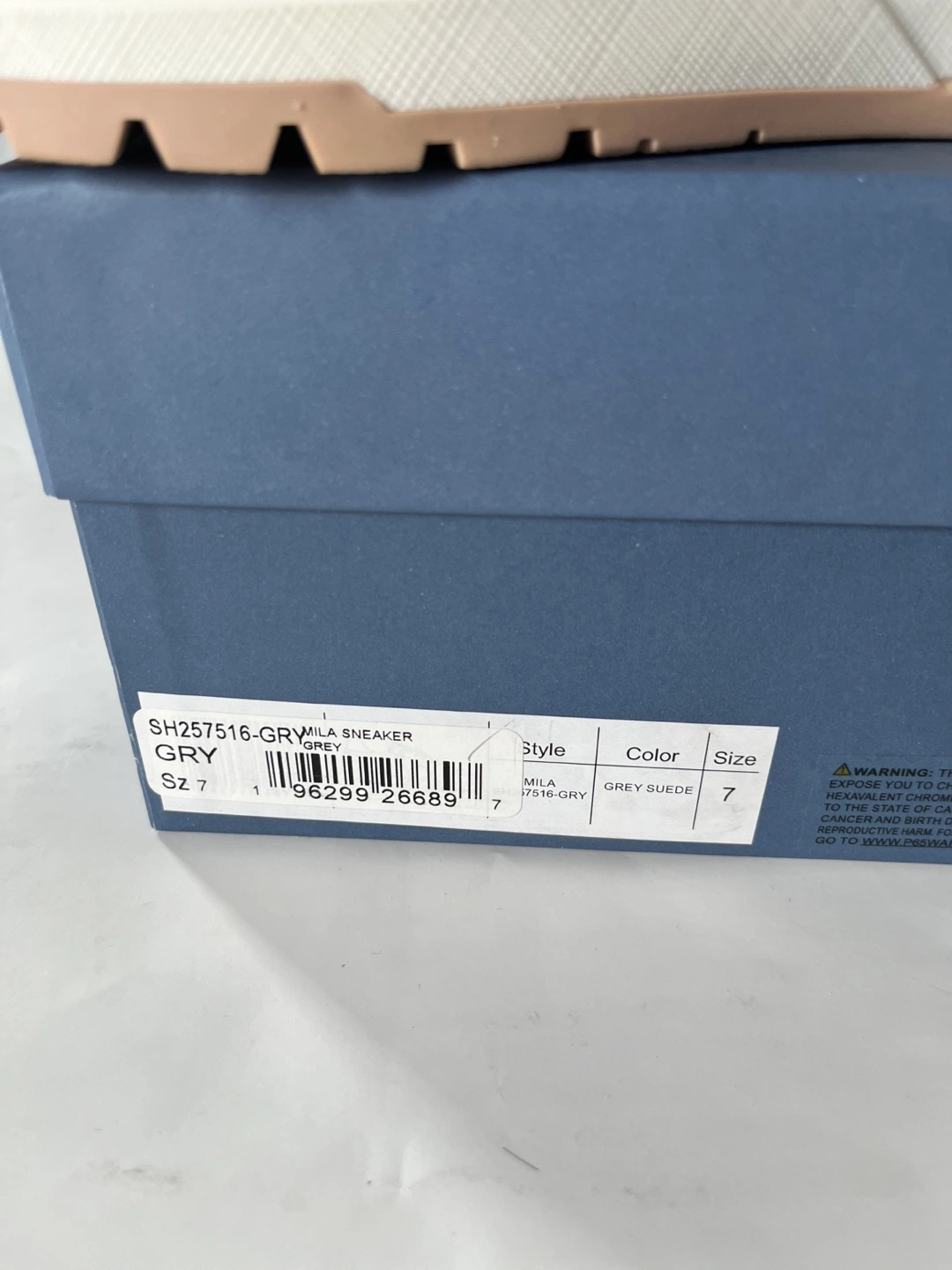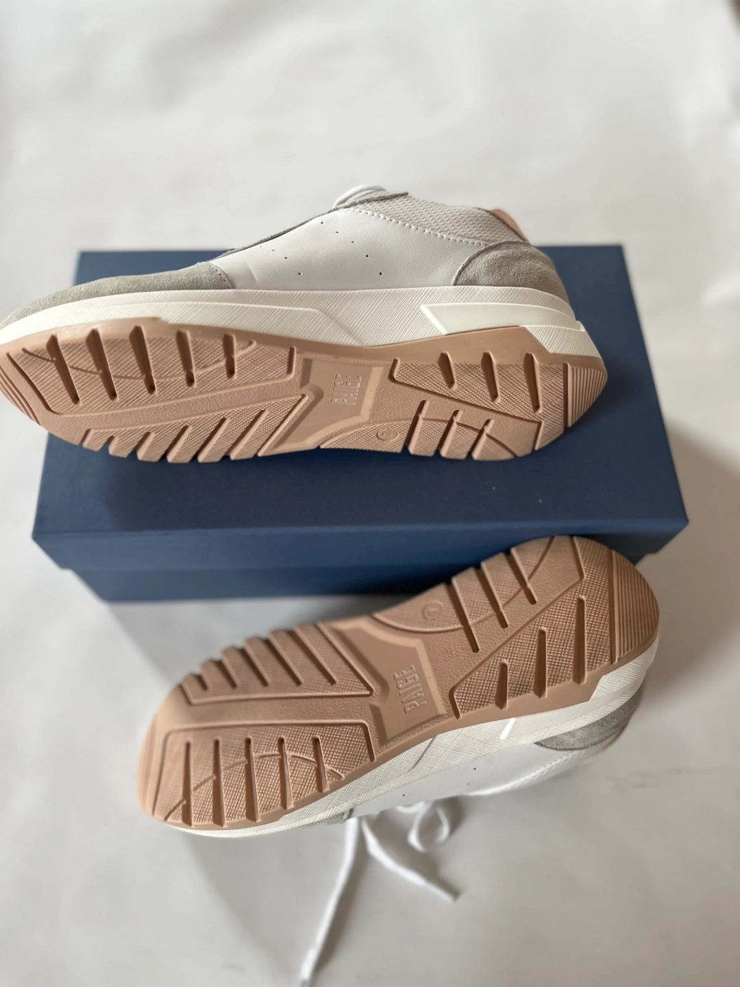 Lovely pair of sneakers in grey suede, white and a hint of rose gold. Perfect for that morning walk. These shoes also include their original box.