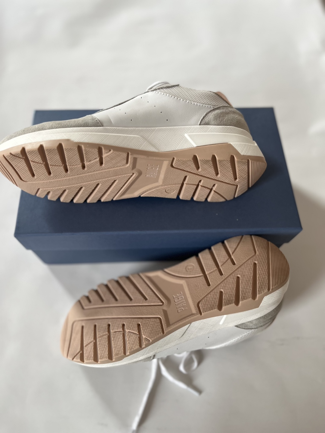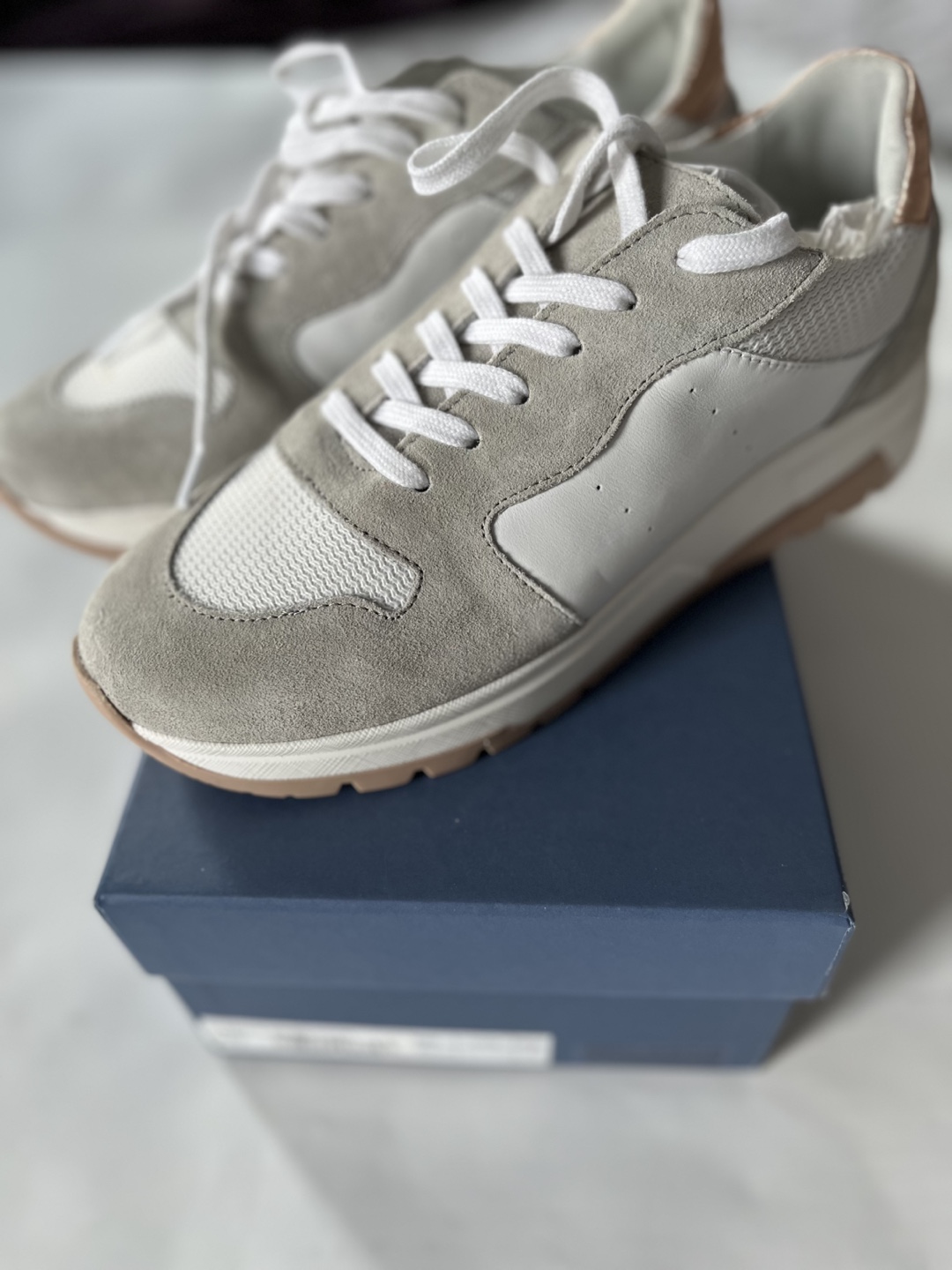 Lovely pair of sneakers in grey suede, white and a hint of rose gold. Perfect for that morning walk. These shoes also include their original box.
