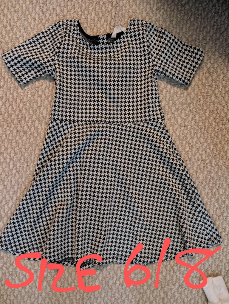 The bundle includes five dresses. There is a white dress with black hearts and a black sash, a pink and white dress with sequin details, a houndstooth dress, a light blue dress with layered tulle, and a red dress with a decorative belt. One of these dresses would look lovely on your little one for a special occasion.