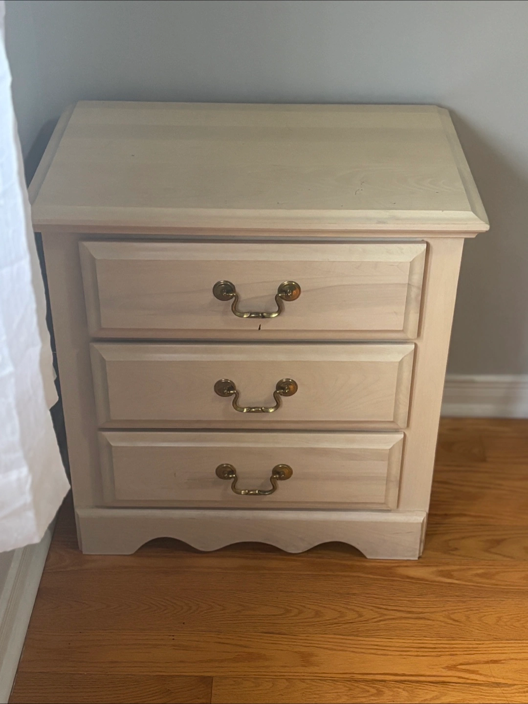 Nightstand with three drawers. Features rounded edges and drawer pulls. Perfect for beside your bed to place your books and other necessities.