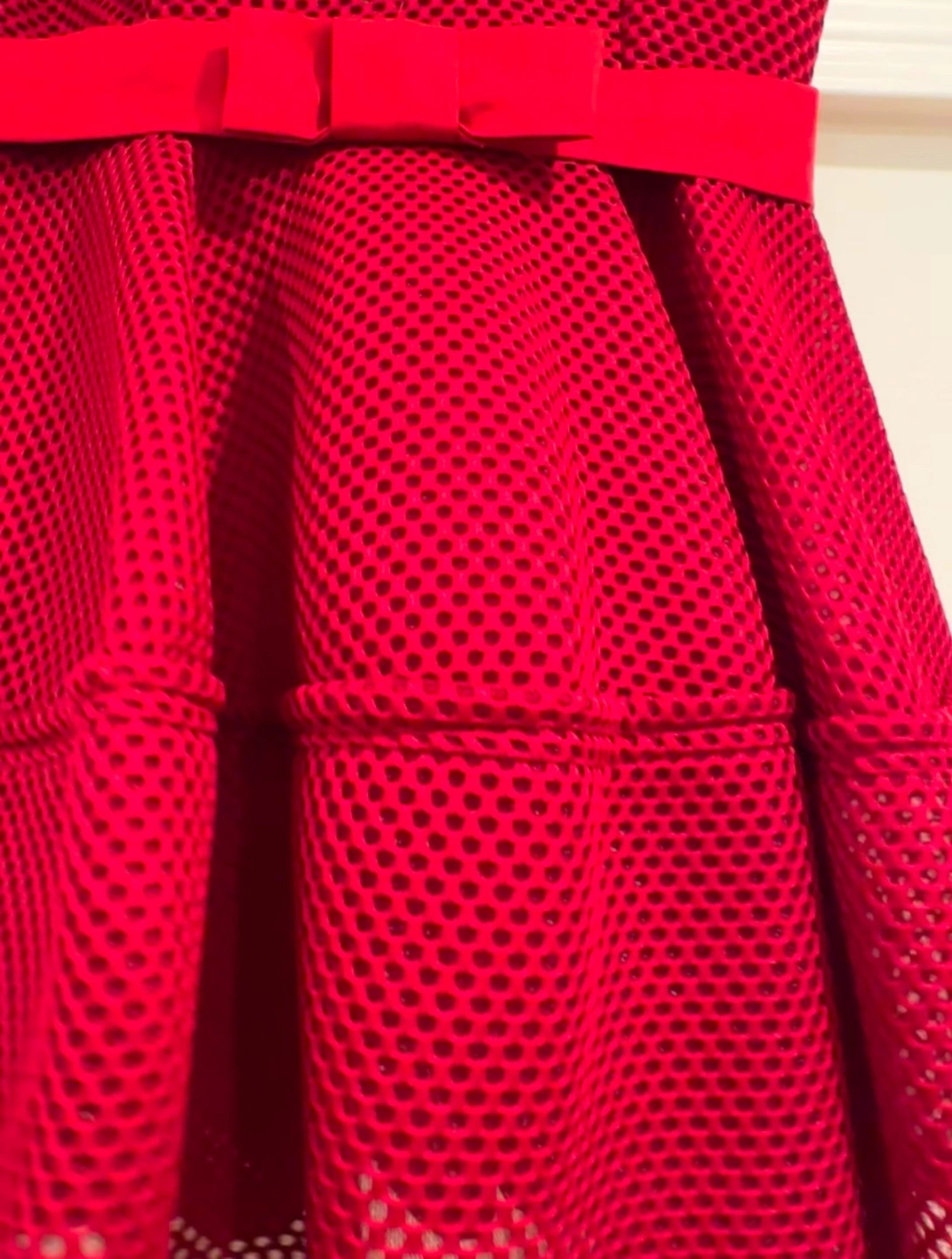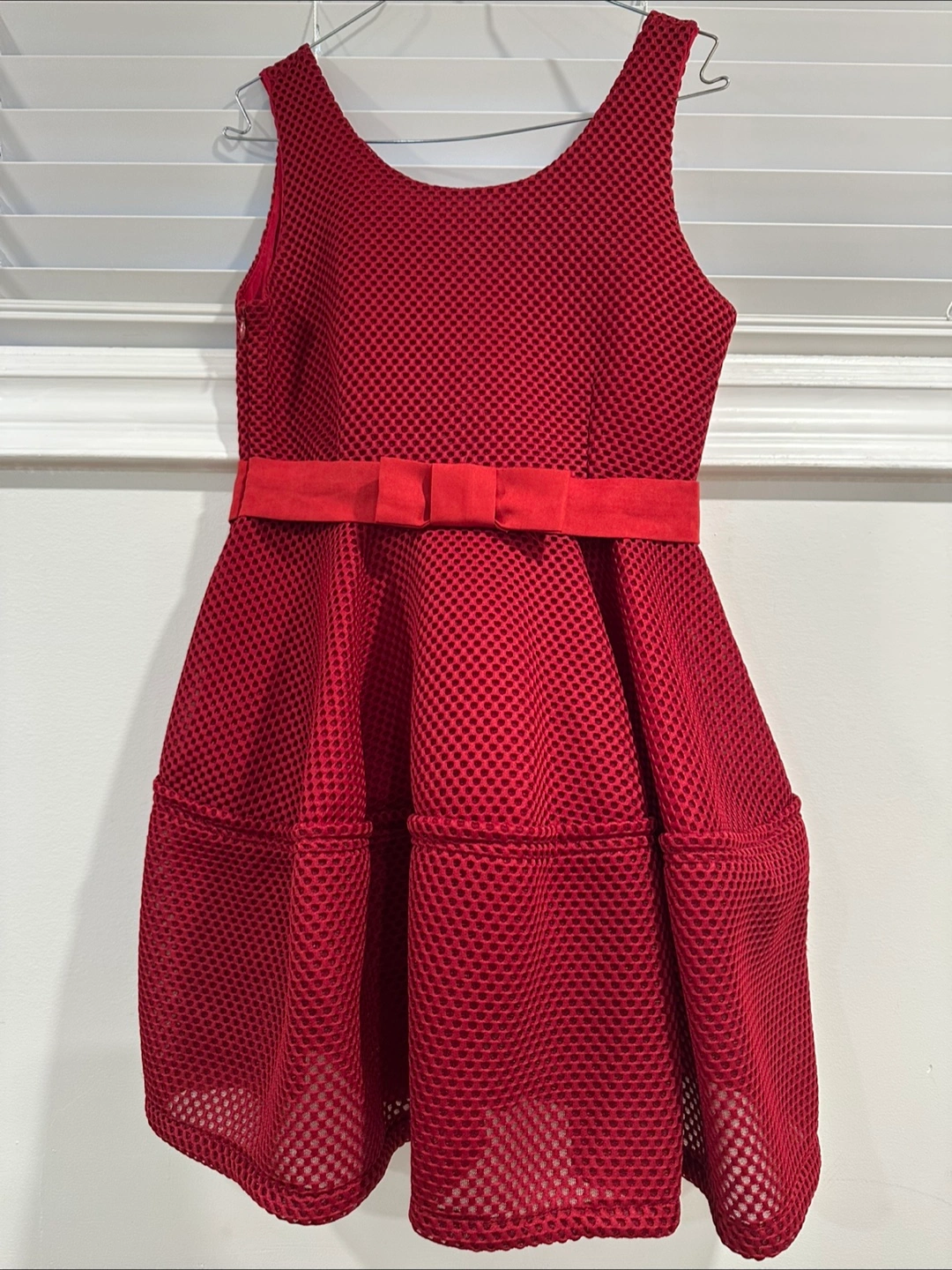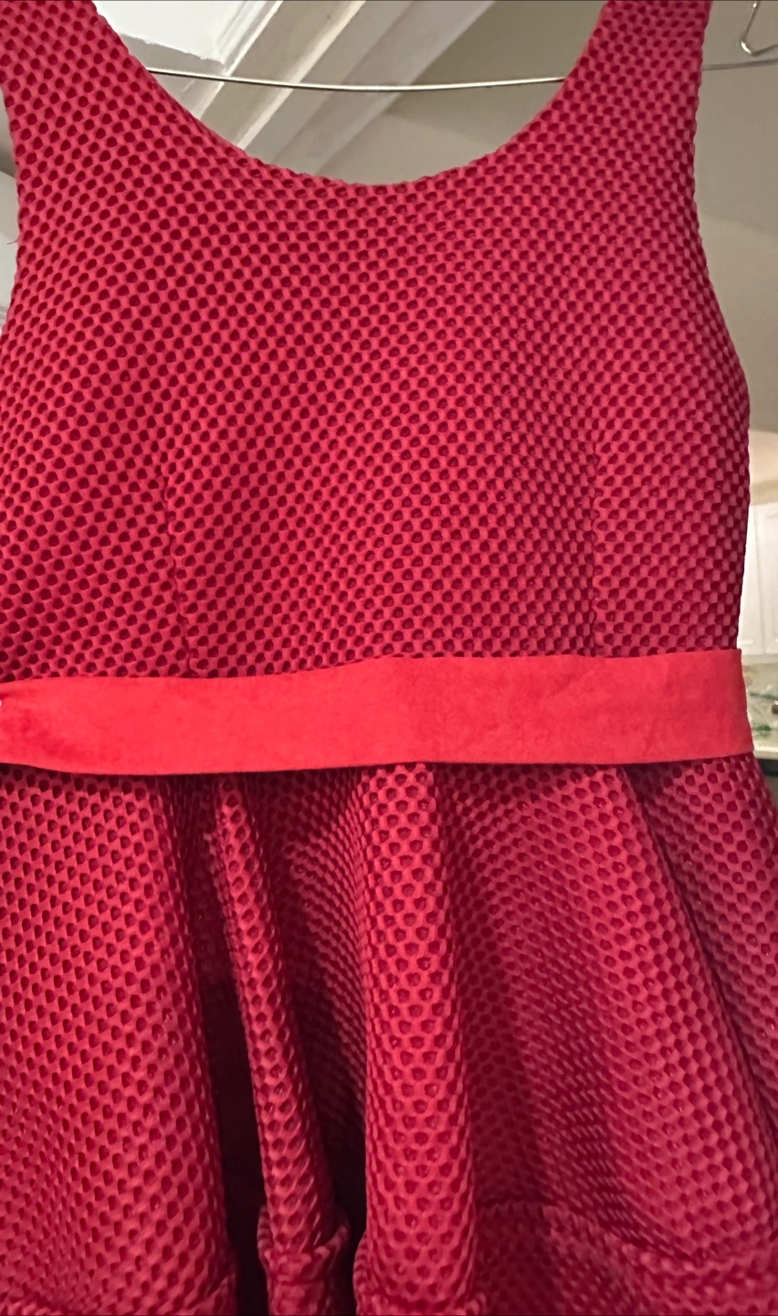 red dress Features a matching built in belt and a detailed texture. A wonderful item to wear to a party and feel good about yourself.
