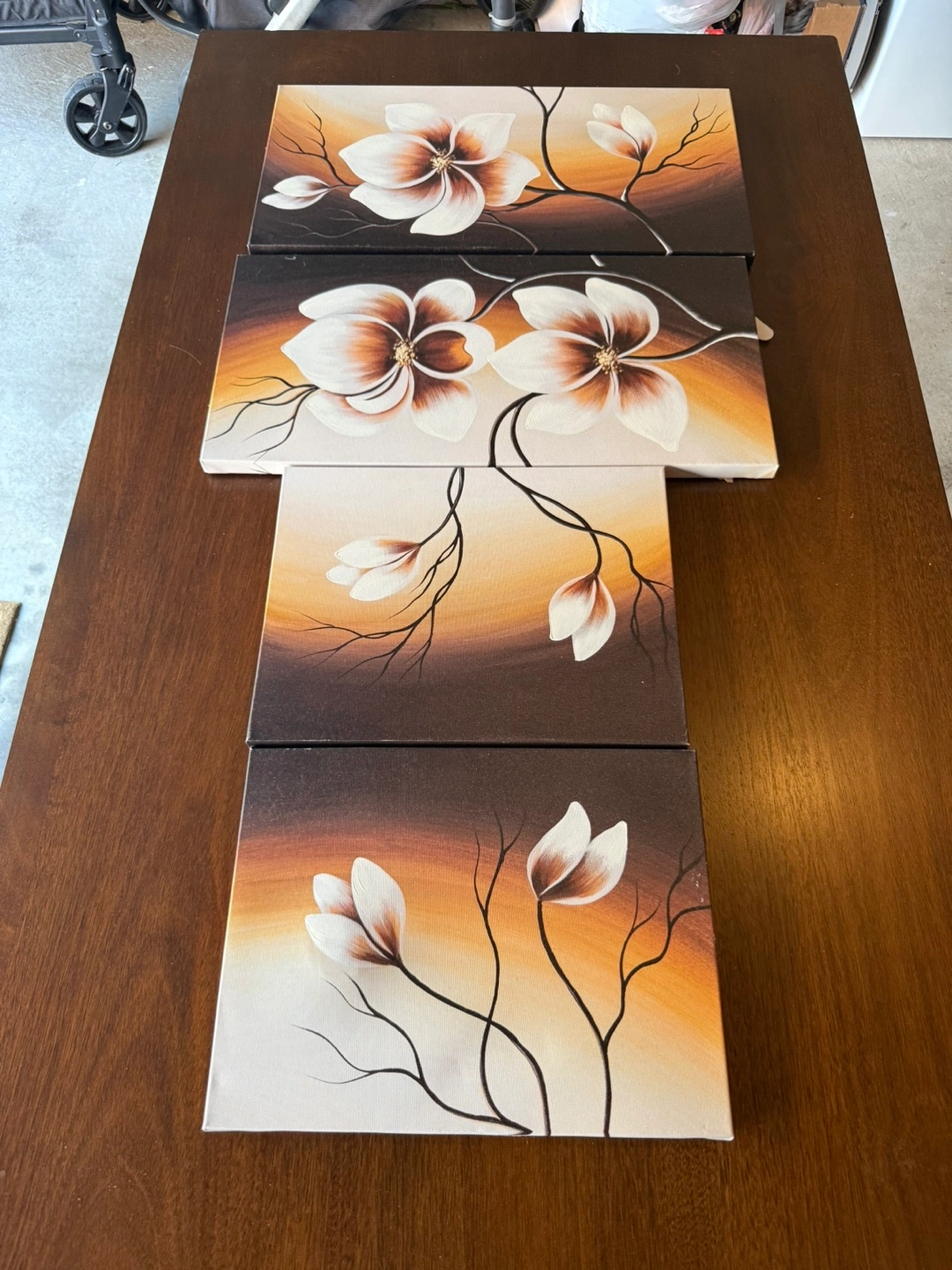 Set of four paintings. Each with a unique design, a floral theme. The colors feature shades of brown, white, and gold. Display these paintings to create a sense of peace and tranquility in any room.