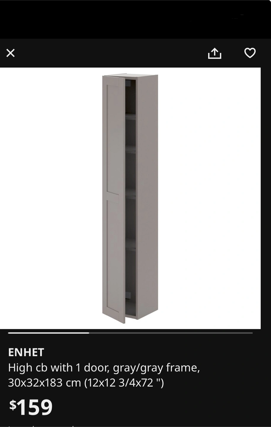 Buy & SellIKEA ENHET Tall Cabinet/StorageIKEA ENHET Tall Cabinet/Storage$70- Bought a year ago - Very good quality and was used as storage - Good as kitchen or clothing storage - Feel free to ask anythingConditionLike newDimensions30x32x183WHERE TO MEET3900 Confederation PrkyView MapSELLERverifiedELINAConfederation Pkwy1233 reviews1 chats·1 favorites·125 viewsSEND CHAT TO SELLERHi ELINA! I’m interested in your listing.Hi ELINA! I’m interested in your listing.Get the Karrot app to chatSign In to chat