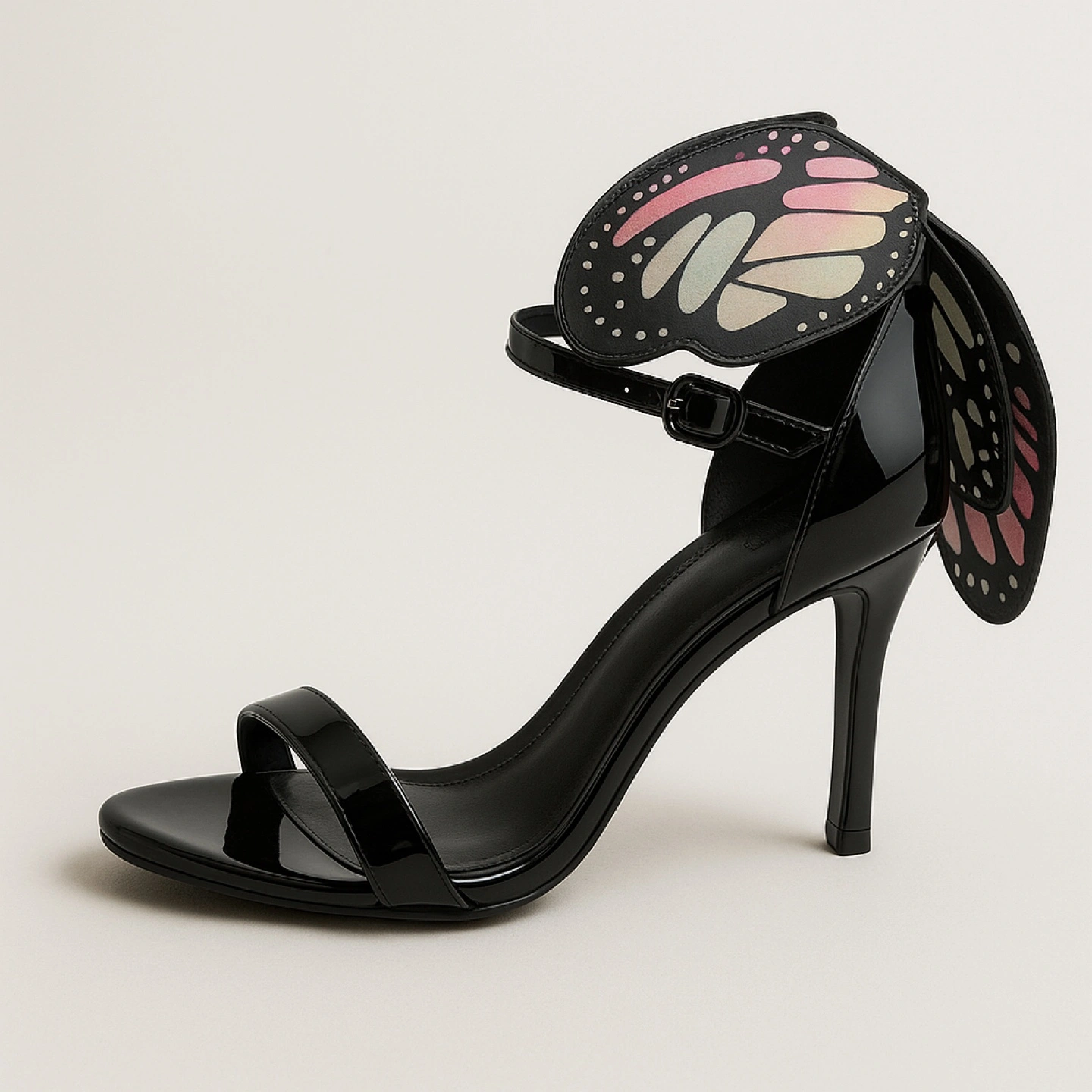 Lovely stiletto heel sandals. Features a delicate ankle strap. Adorned with a butterfly wing detail at the heel. You may find it comforting to wear these for a special occasion.