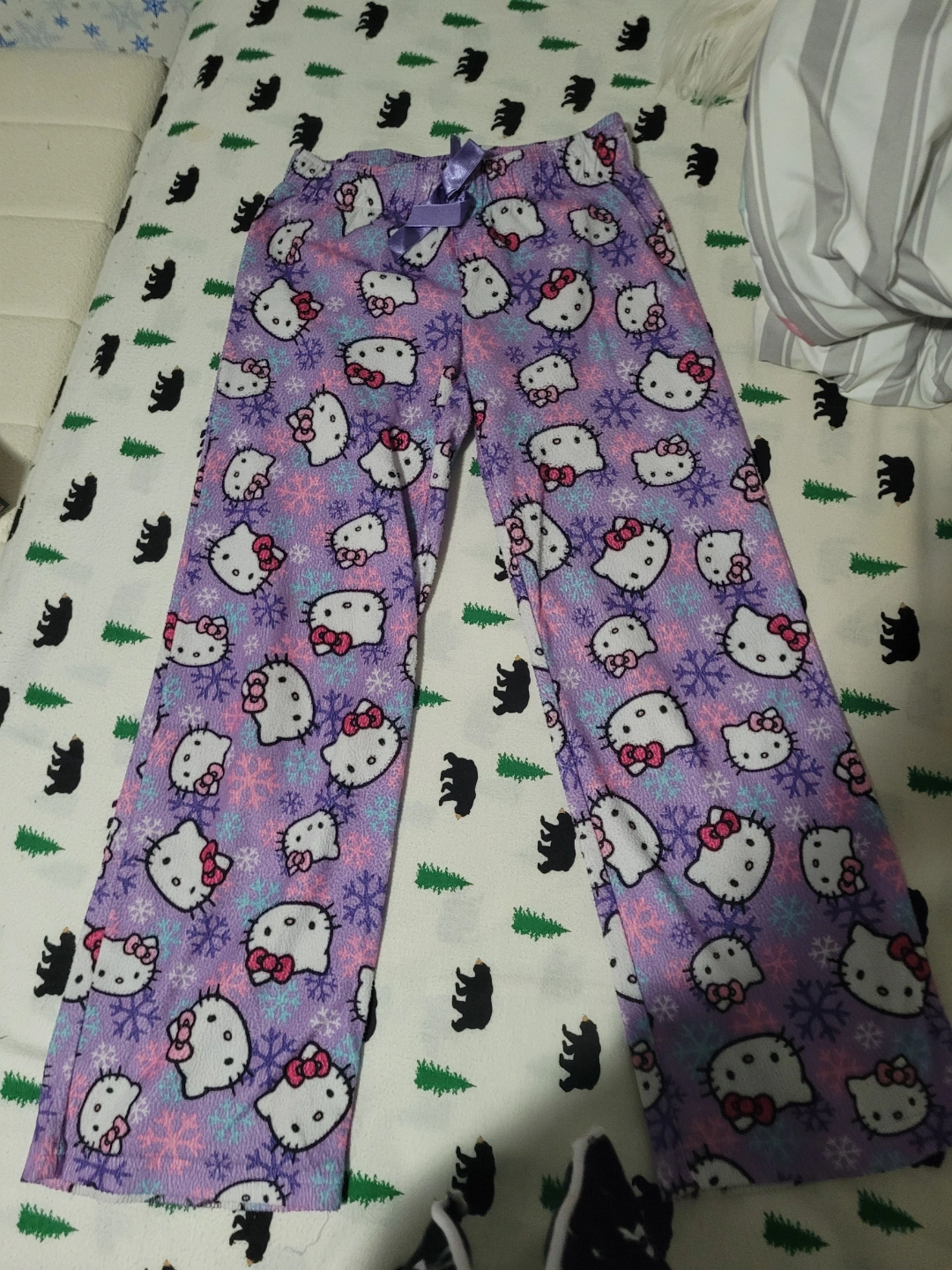 These cozy pajama pants are perfect for lounging around. They are covered in Hello Kitty prints. The pants have a drawstring closure. You can get a good night's sleep wearing these pants.