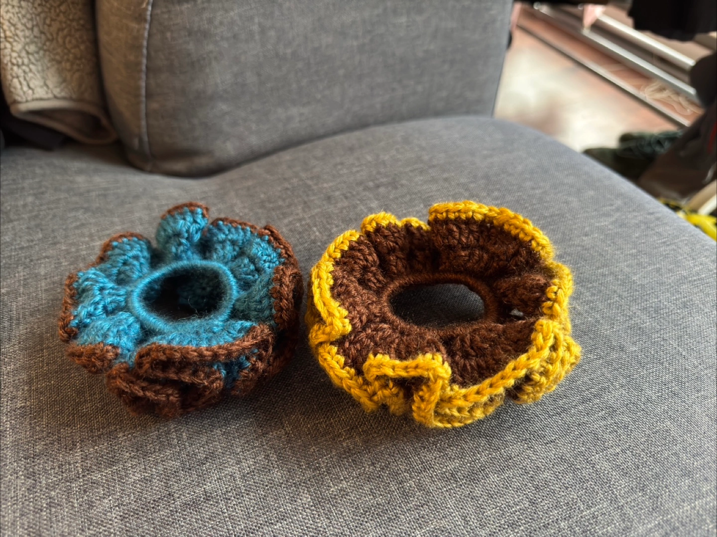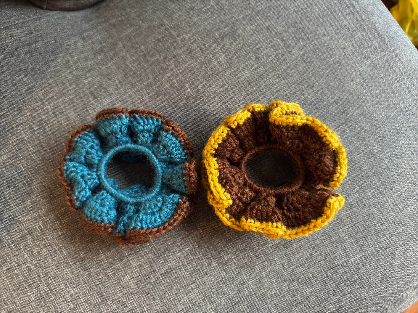Scrunchies, hand-crocheted in two different colour schemes. Each has a frilly edge design. The first has a blue centre with brown accents and the second a brown centre with yellow accents. A great way to add some comfort and style to your everyday life. The price is for each Ready to go Pickup at V5H0J8