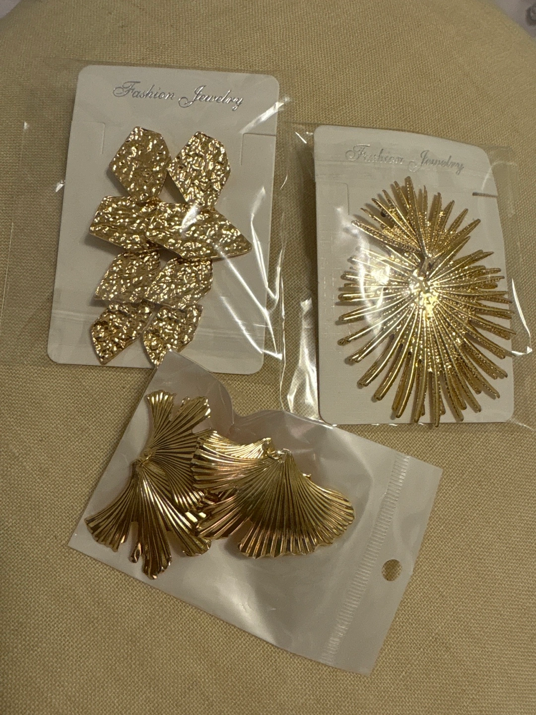 I am selling a lovely set of gold fashion earrings. There are three different pairs; one looks like a sunburst, another resembles a flower, and the last pair has a fan-like design. You can choose from different styles to match your outfits, knowing they will look fantastic.