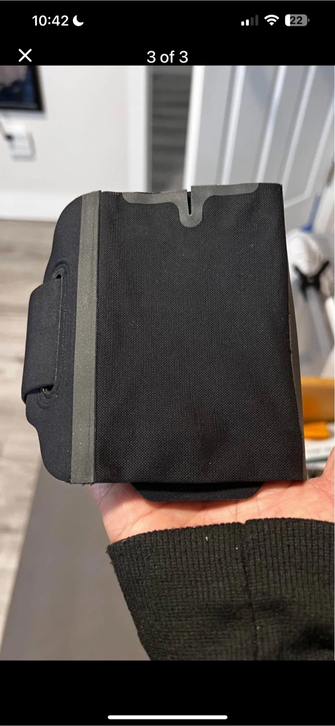 A black running armband. Offers a secure fit. Perfect for keeping your phone and other essentials safe while running or exercising, keeping you relaxed and focused on your workout.