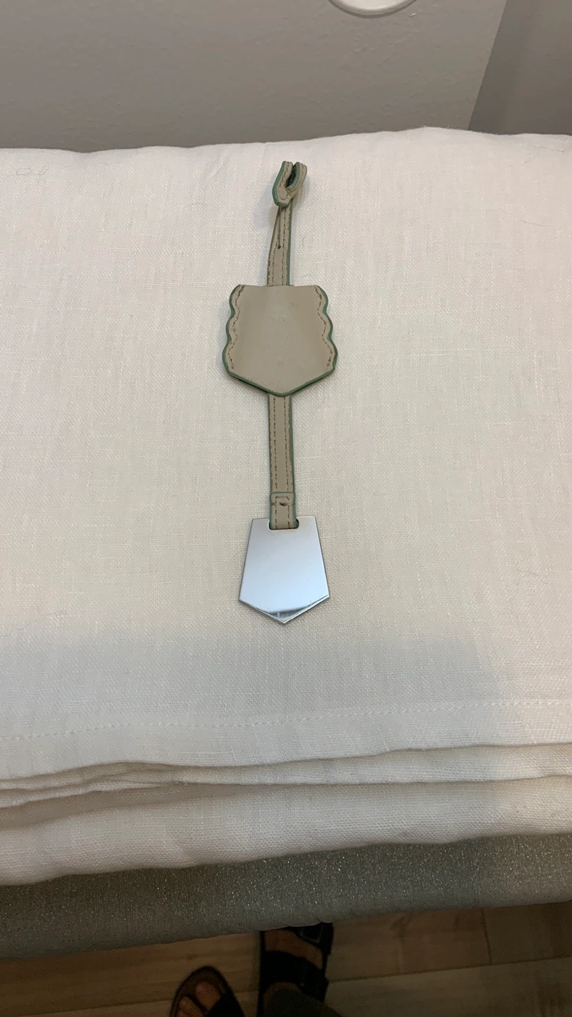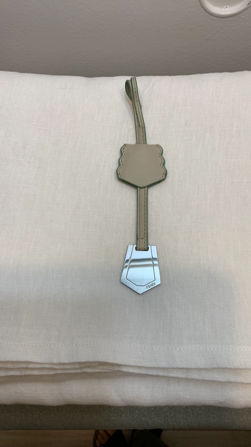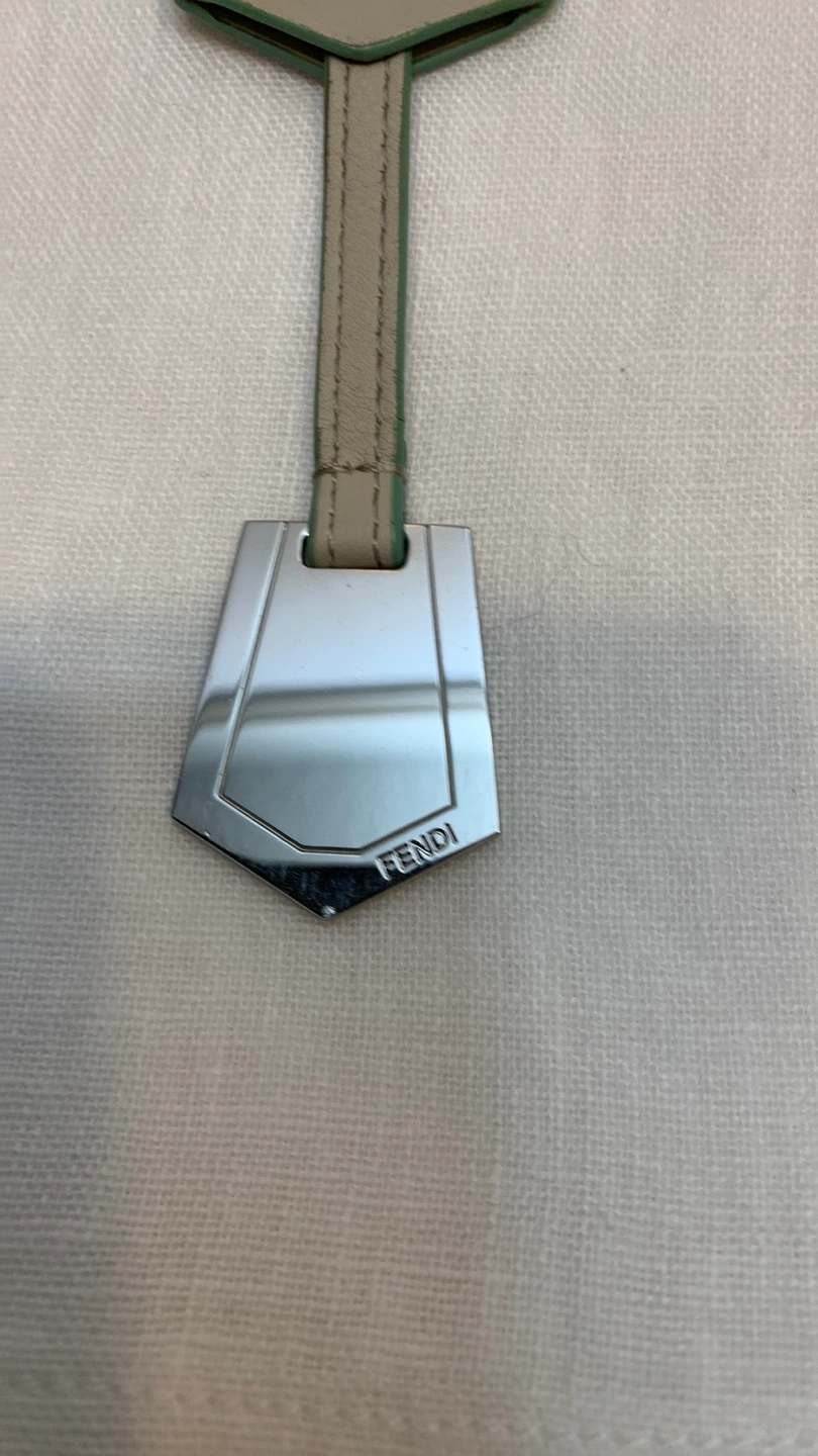 A key chain with a light grey strap and emblem. The emblem is shield shaped and has the Fendi logo imprinted. The emblem has a small green outline. A perfect way to add a bit of luxury to everyday life.