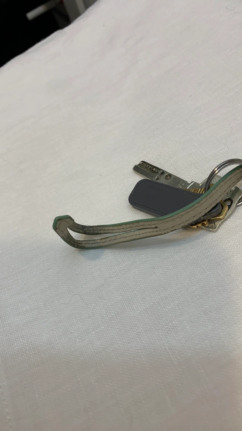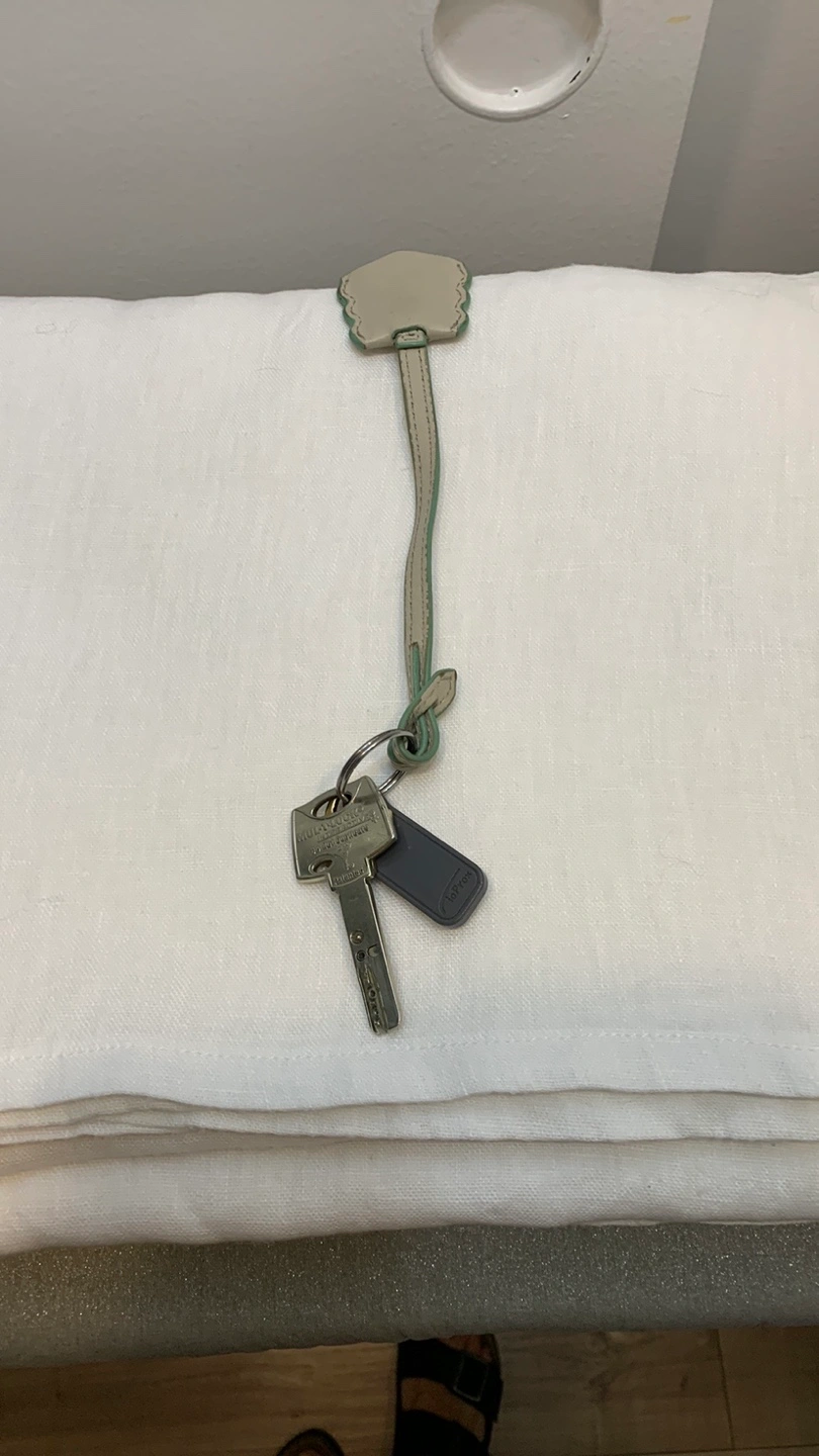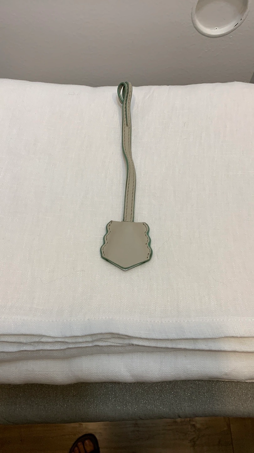 A key chain with a light grey strap and emblem. The emblem is shield shaped and has the Fendi logo imprinted. The emblem has a small green outline. A perfect way to add a bit of luxury to everyday life.