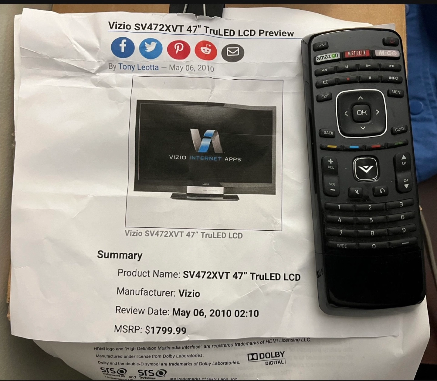 Vizio SV472XVT 47" TrULED LCD. Older model.