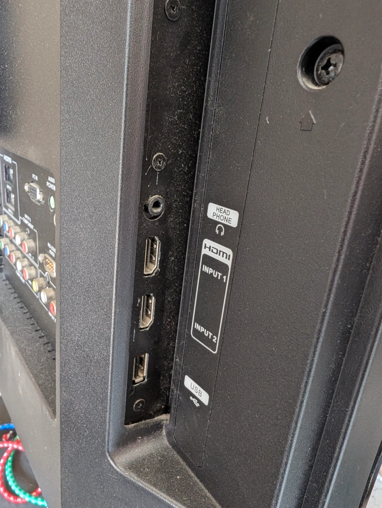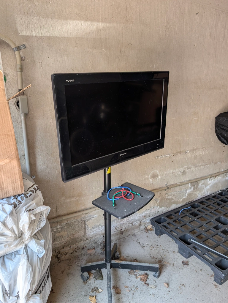 A Sharp Aquos TV. Mounted on a mobile black stand. Multiple input ports. A great addition to any home or office for entertainment purposes. can be used as a separate screen for security cameras as well.