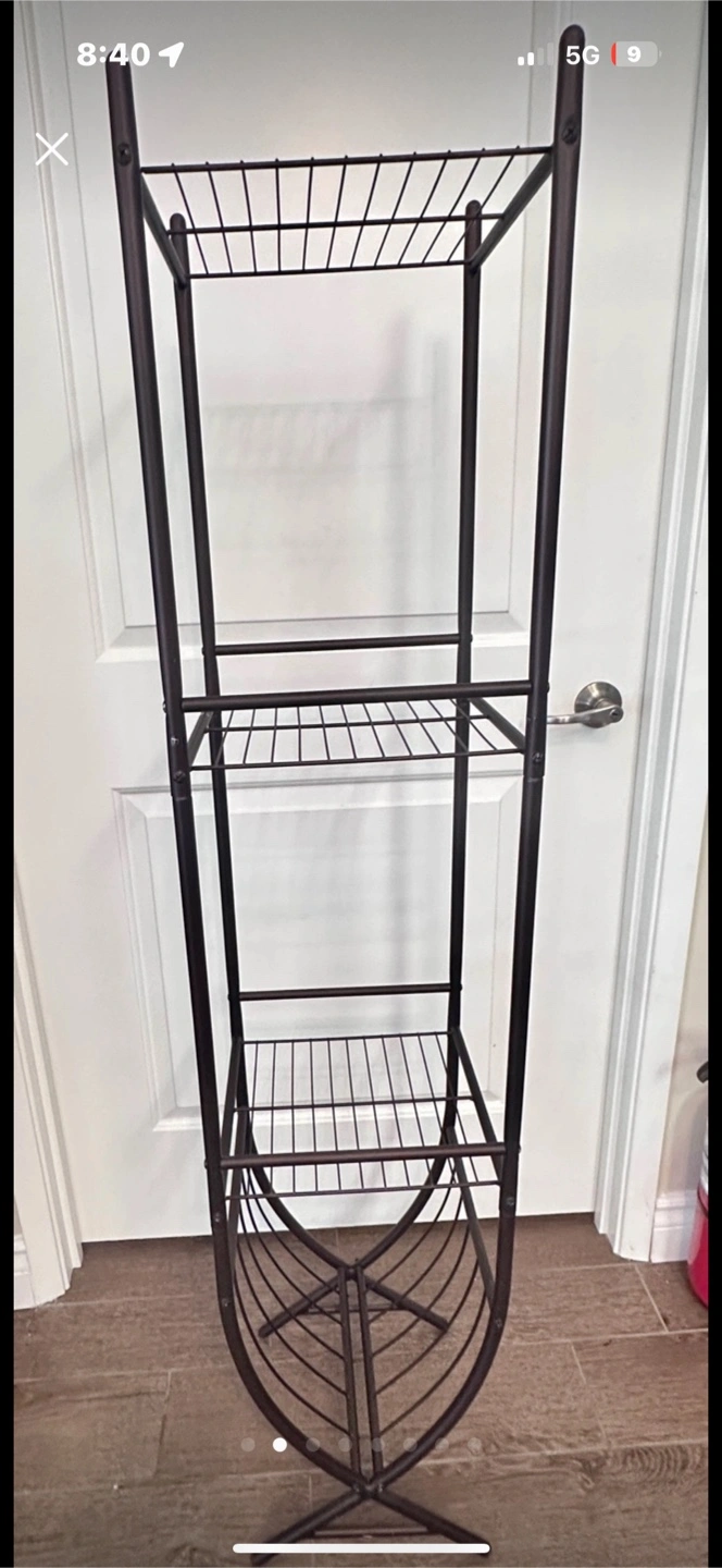Dark metal shelf, featuring multiple wired storage shelves and an additional curved wire basket at the bottom. Its dark colour will add a peaceful touch to any room. This is a great item to display all of your lovely plants.
