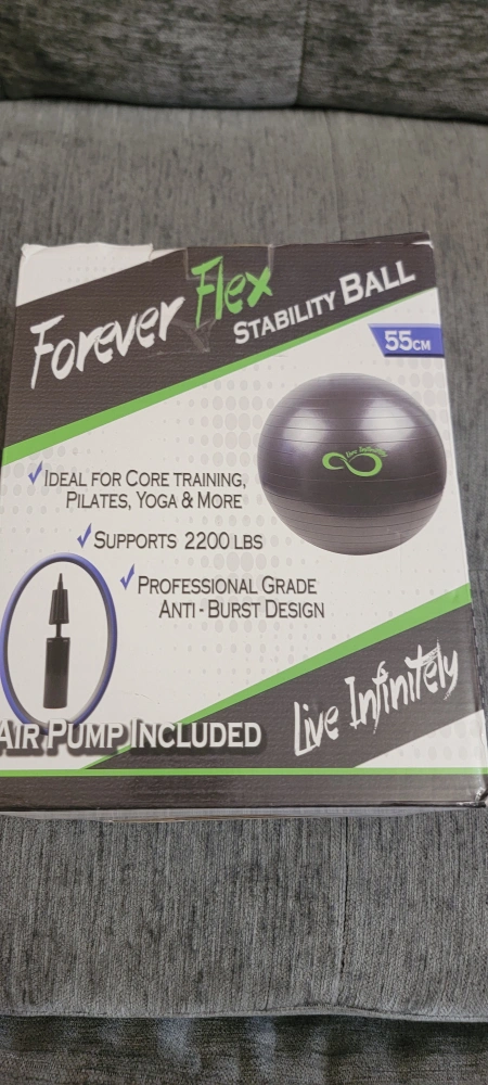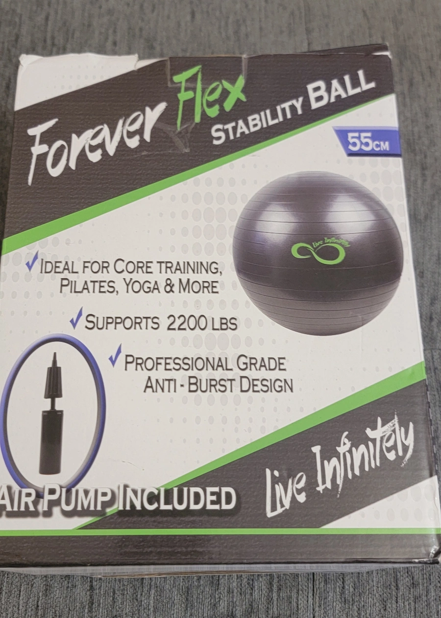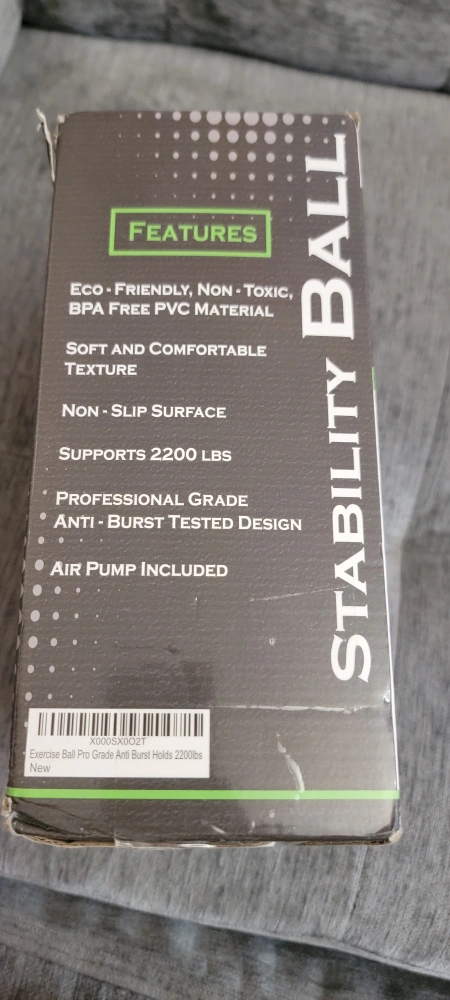 The box shows the ball. The ball has a professional grade, anti-burst design. An air pump is included. You can use this for core training, Pilates, yoga and more. A relaxing way to stretch and de-stress after a long day.