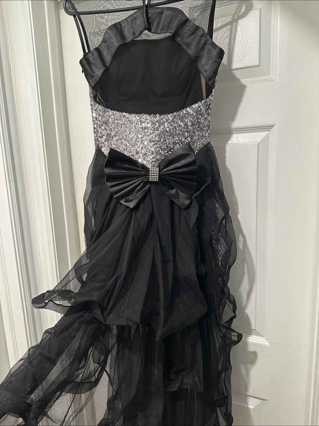The dress is a beautiful combination of black tulle and a sequined bodice. Features a large bow with a rhinestone accent. Could be perfect for a special occasion.