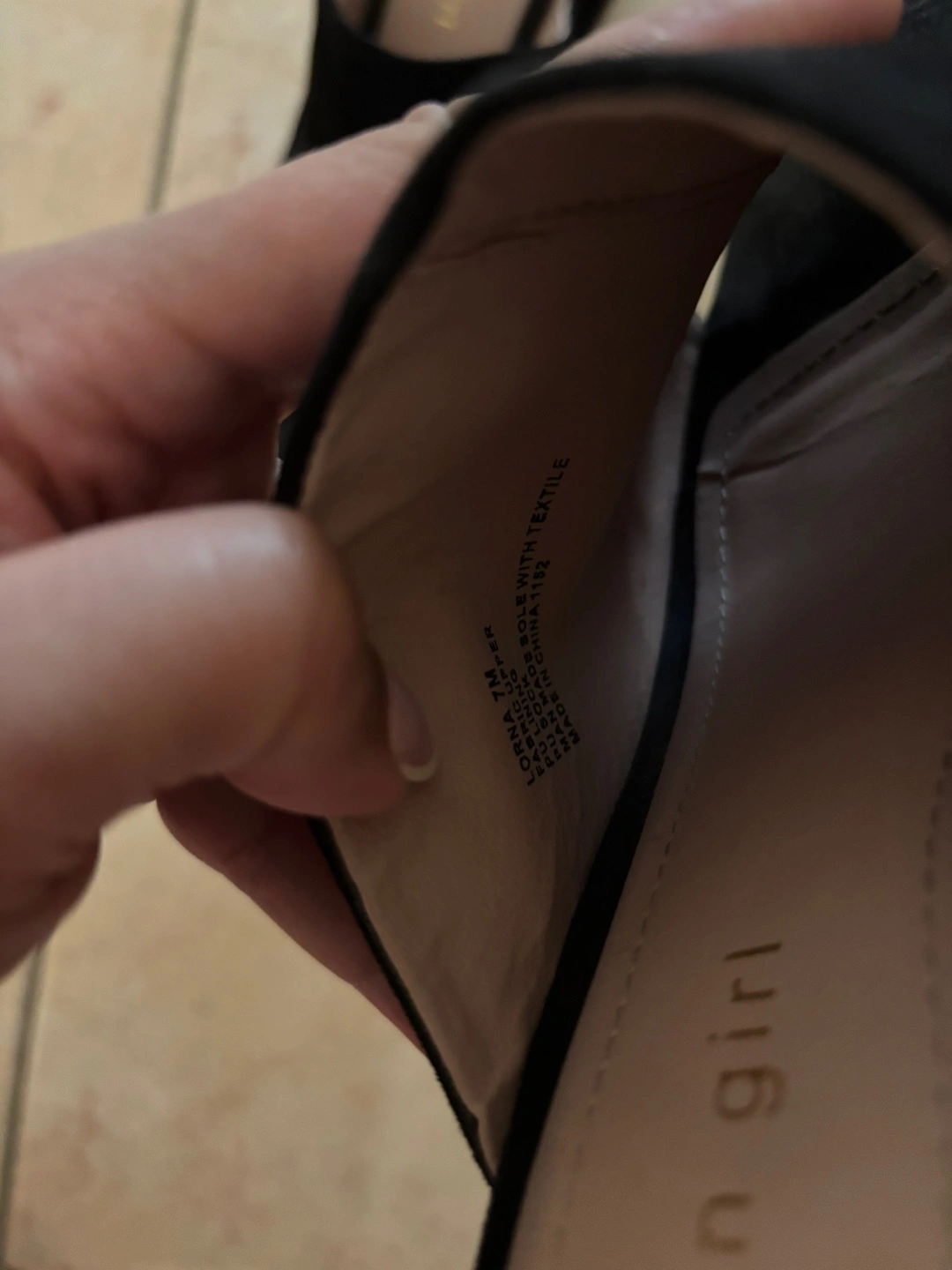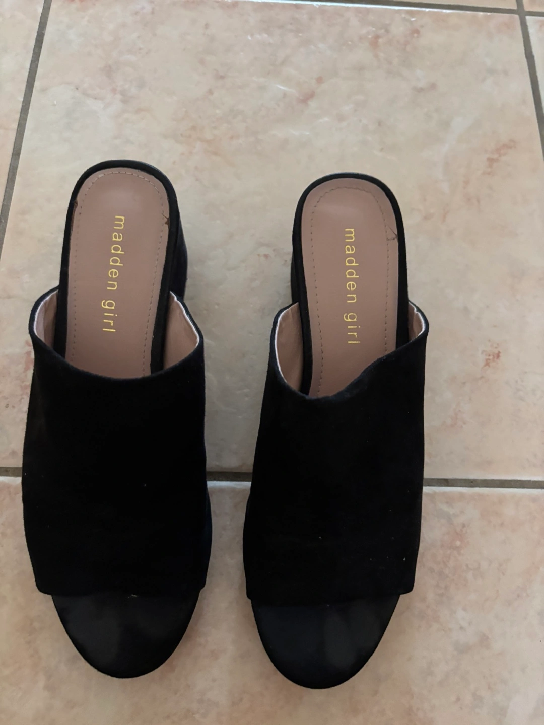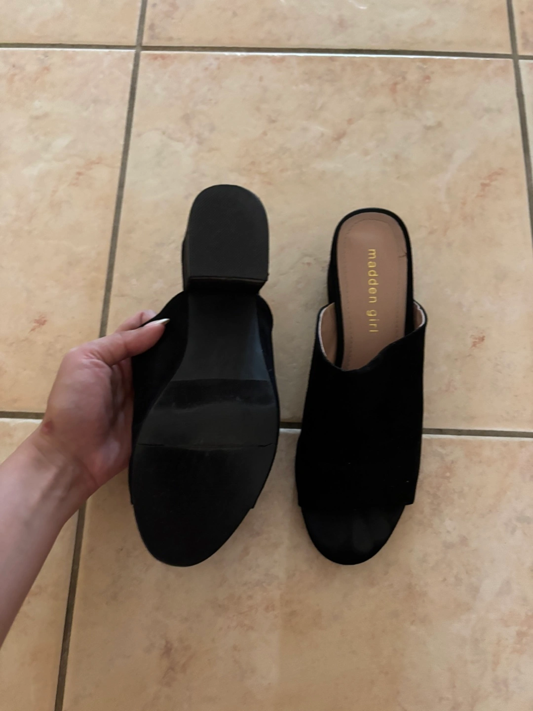 25Black heels. Open-toe style. The sole appears solid. These heels would be great to add to a simple outfit for a little bit of comfort and style.