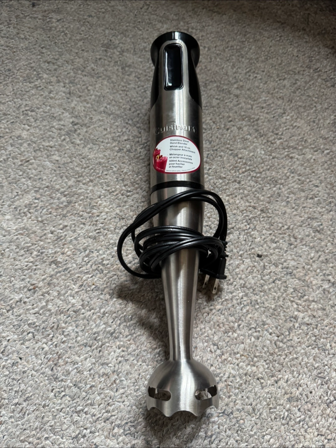 Like new barely used cuisinart brand emulsion hand blender. Multiple set and comes with chopper a whisk attachment and extra storage cup.