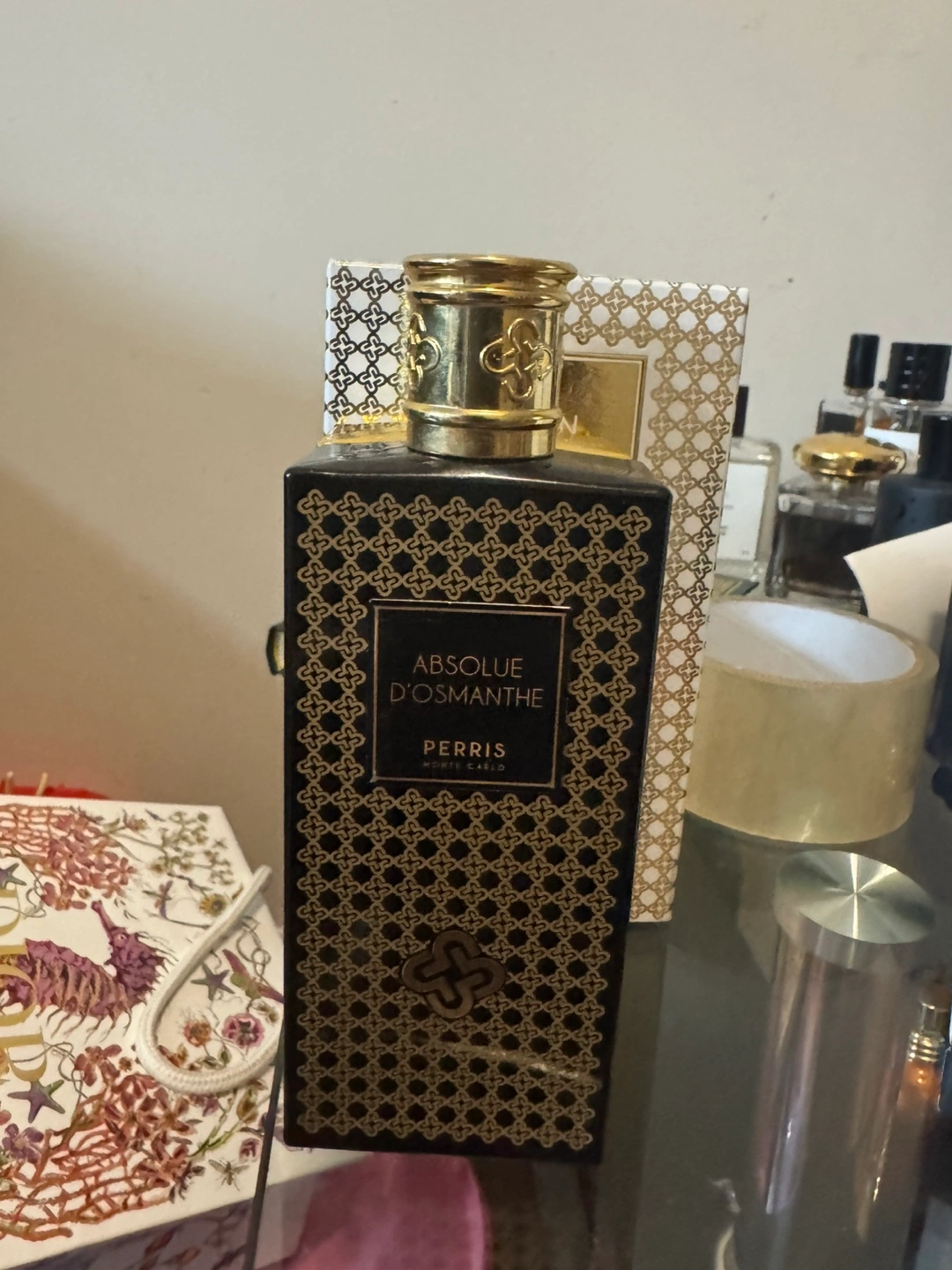A stylish fragrance bottle. The bottle has a gold cap. The bottle has a patterned design. I think you will enjoy spritzing this perfume for a moment of serenity.