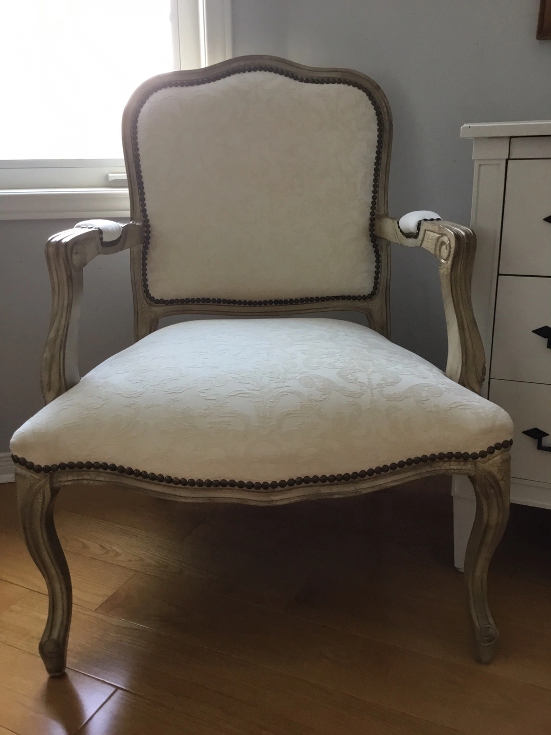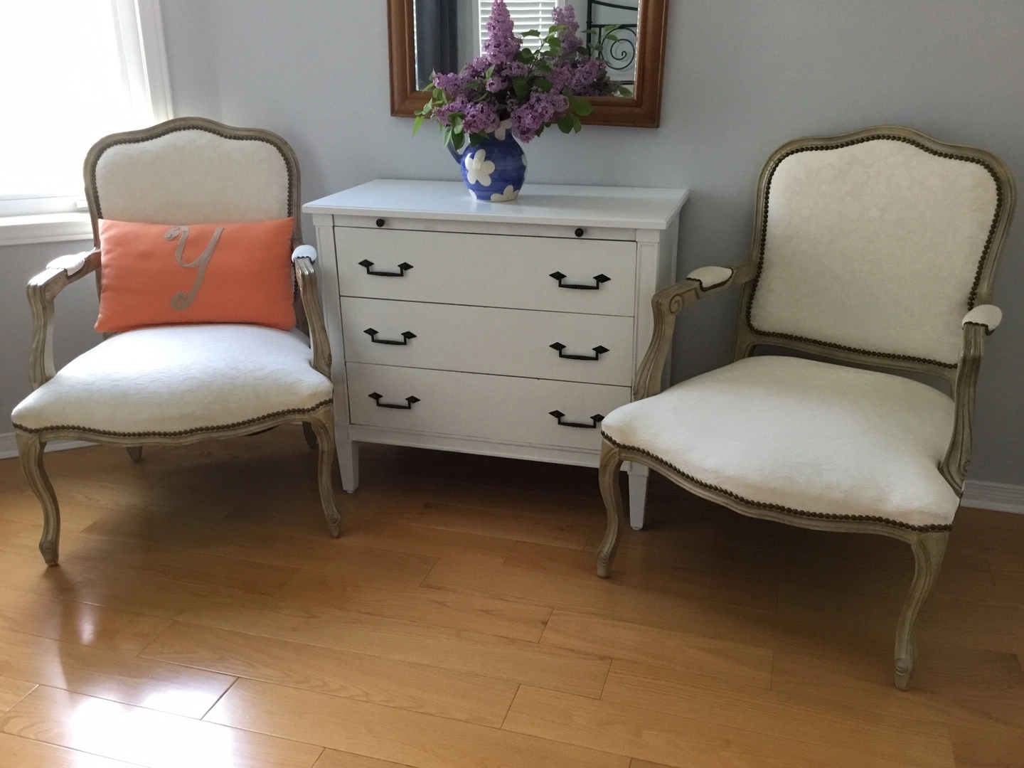 A beautiful pair of French provincial chairs, upholstered in a ivory fabric. The frames are a light taupe wood with detailed carvings. You can simply sit and read a book in these chairs.