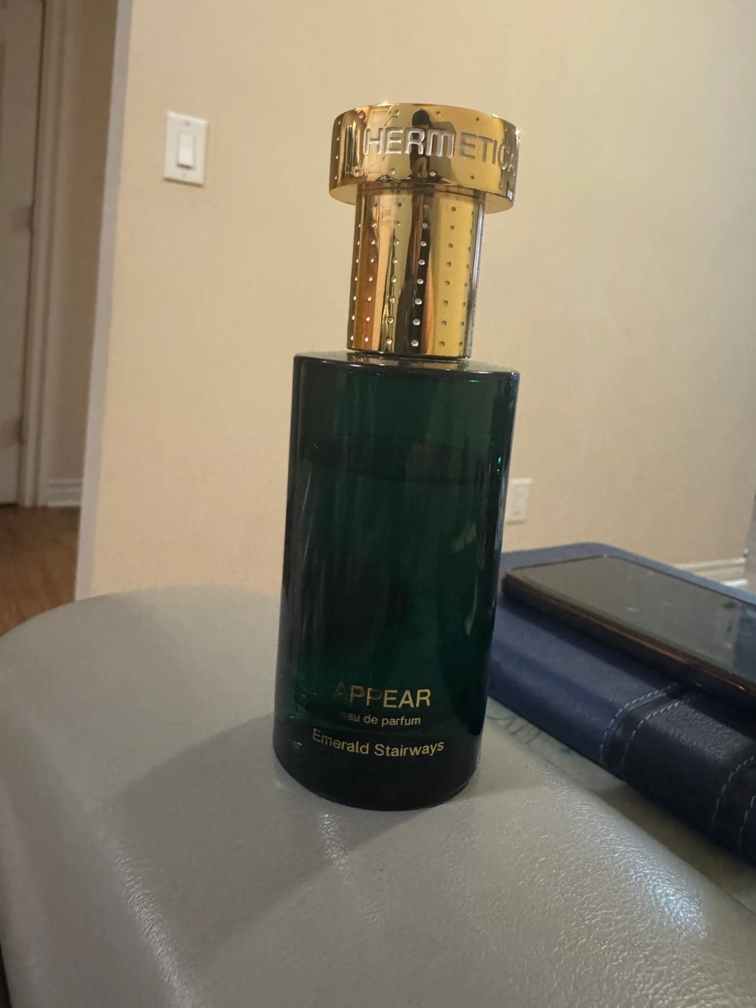 An eau de parfum bottle. Emerald green bottle. Golden cap with the brand name. Great for a spritz before you go out to set the tone for a lovely day.