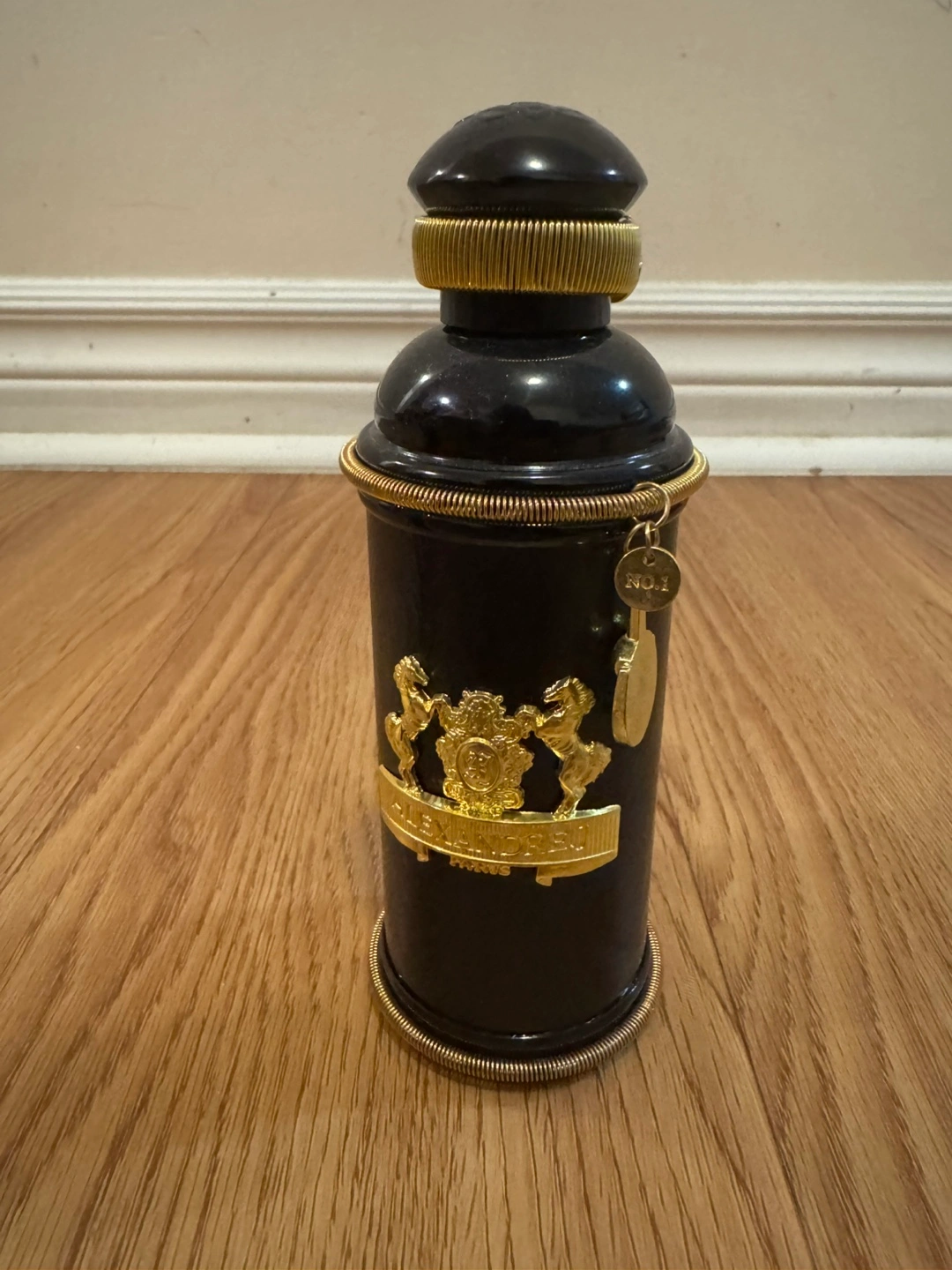 A black perfume bottle. Features gold embellishments and a key charm. Has a cylindrical shape. It's a beautiful piece to have on display.