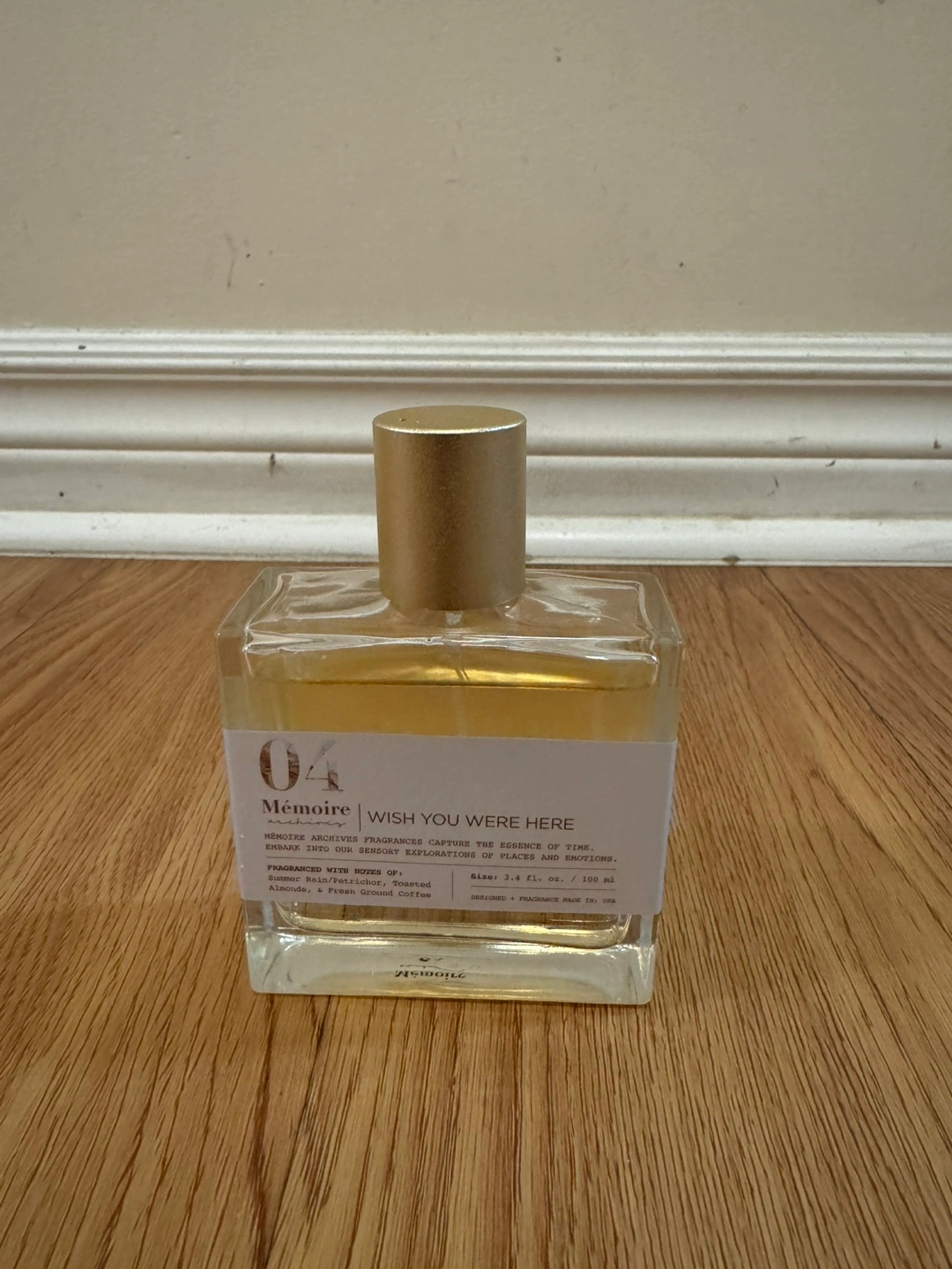A lovely fragrance in a square glass bottle. It has a gold-tone cap. The bottle includes a label with text. A perfect scent to wear to unwind after a long day.