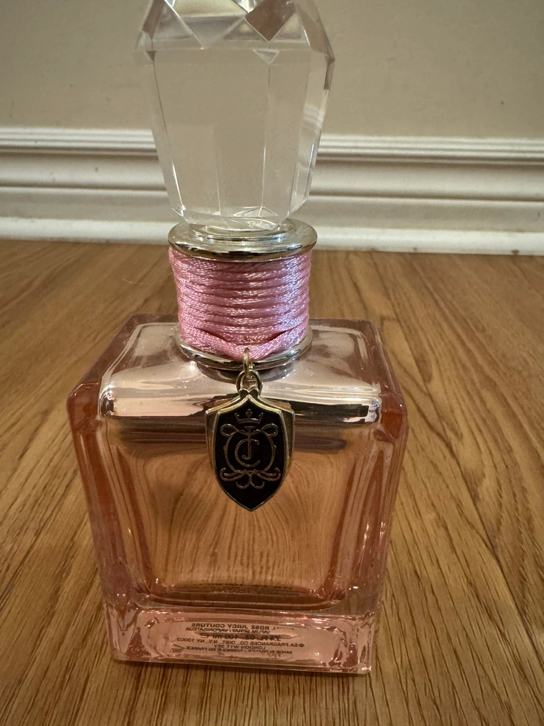 A beautiful perfume bottle, the design is exquisite. The glass bottle is a soft pink. It features a clear, decorative top, and a cute charm. To spray this perfume on a night out would be lovely.