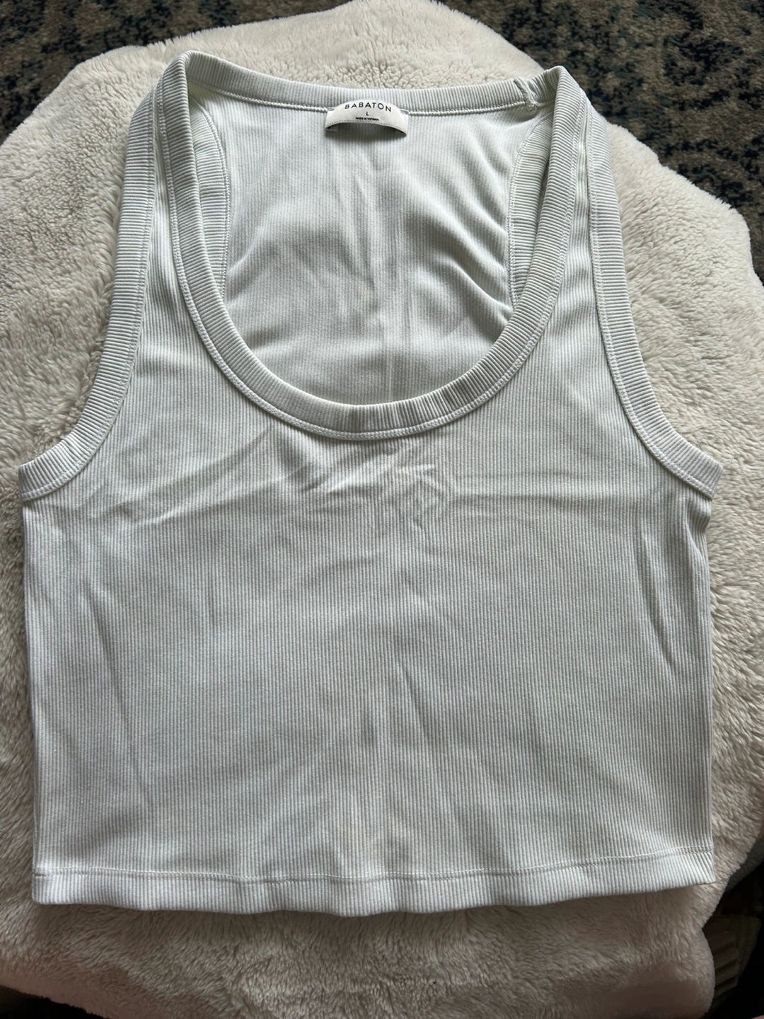 A light-coloured tank top. Features a ribbed texture. Sleeveless. Made with a scoop neck. A great piece to throw on for lounging.