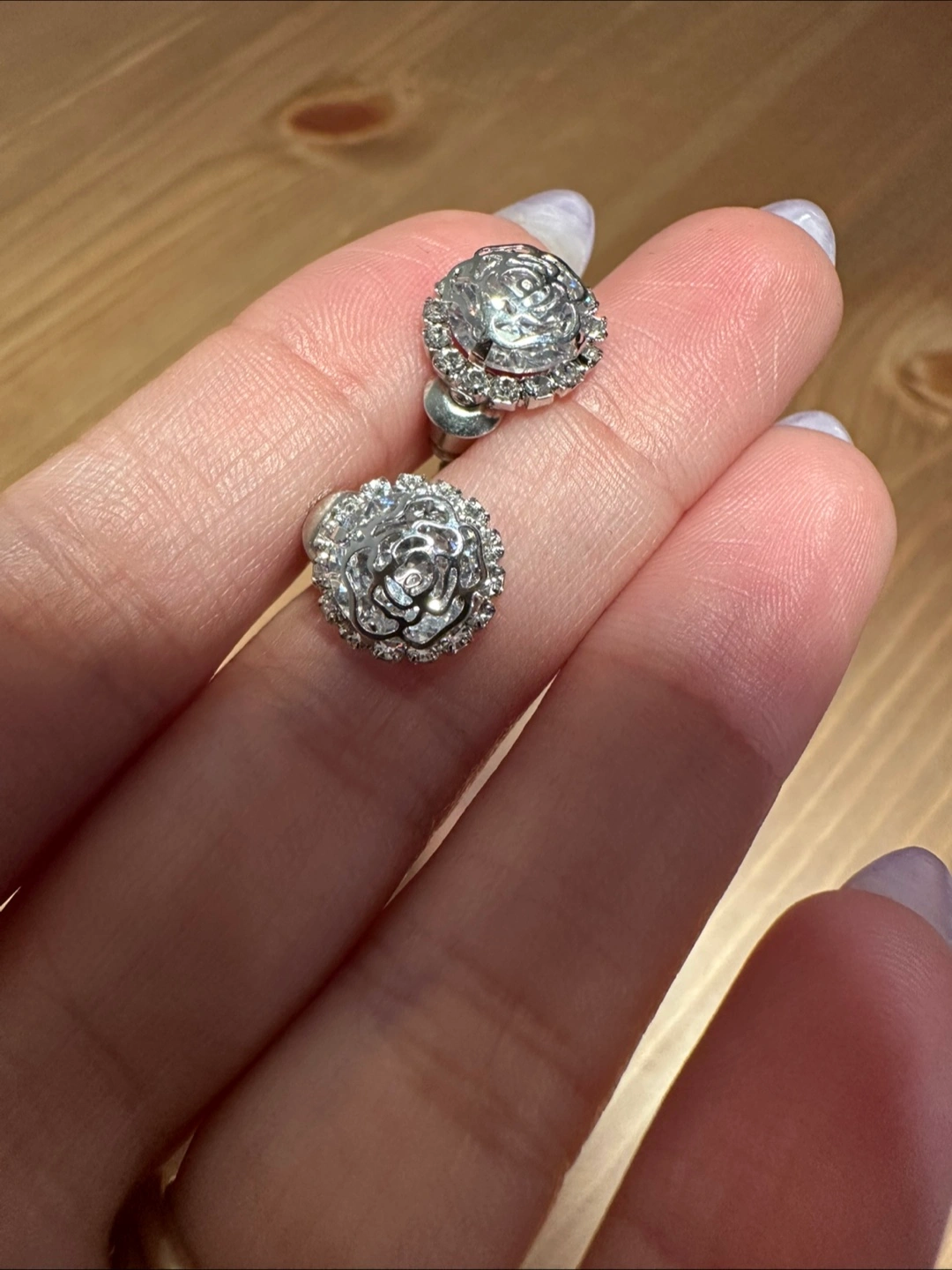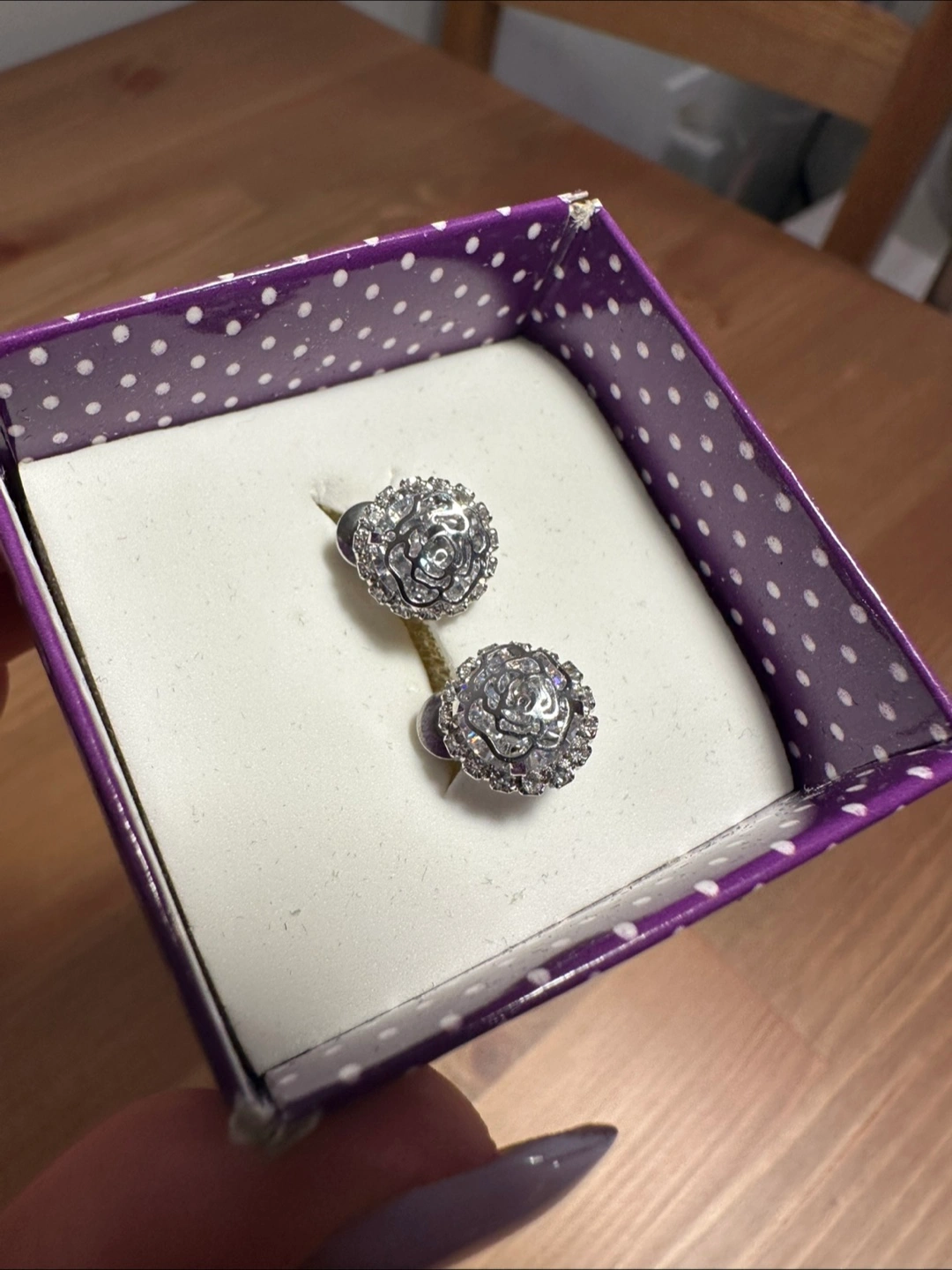 Floral stud earrings. Featuring a central flower design. Studs are framed with small stones. The earrings arrive in a charming, polka-dot box. These earrings would look amazing when going on a date.