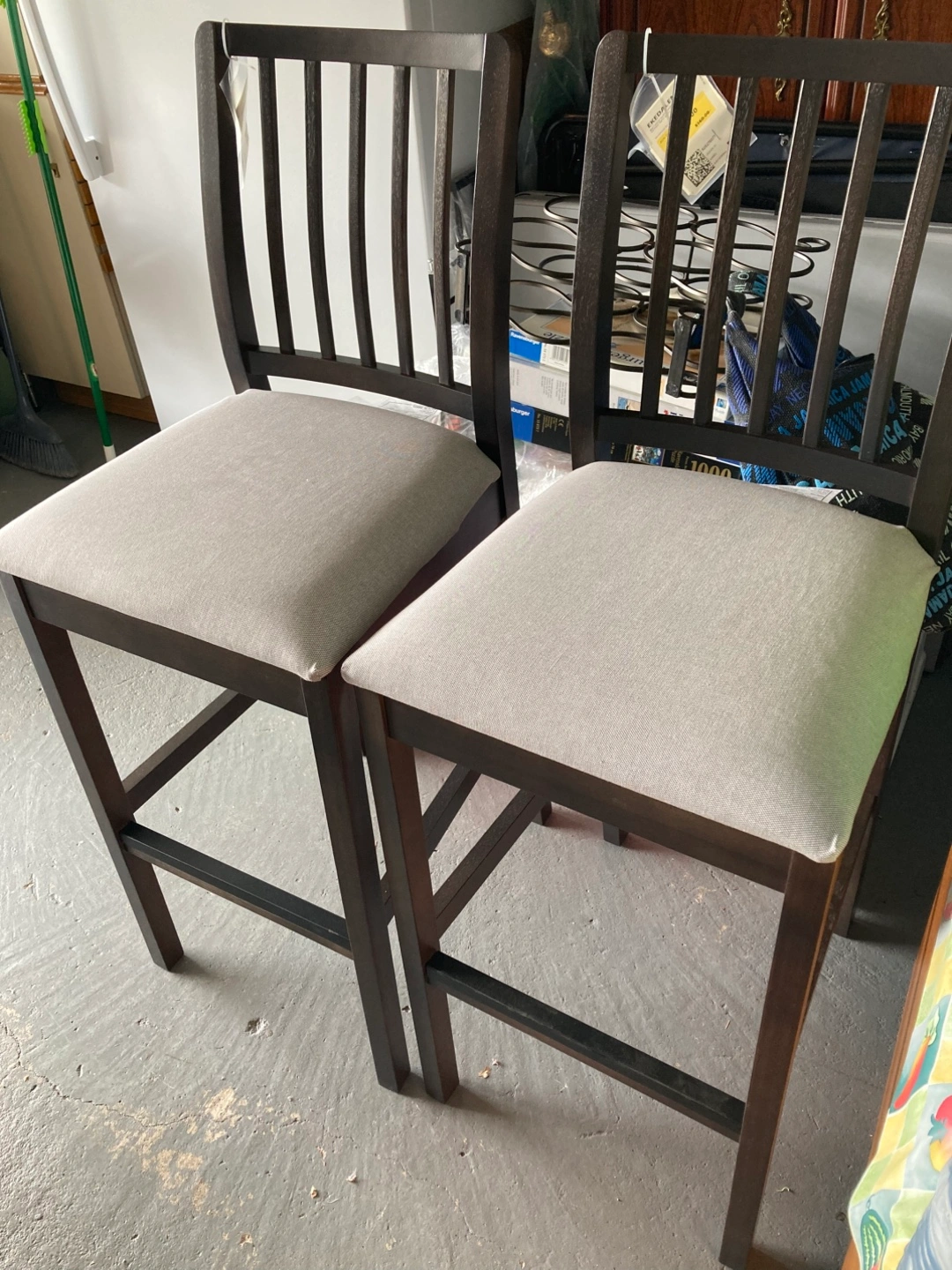 NEW 2 Dark brown wooden bar stools Grey fabric seat cushions. Supportive backs. You will find these counter stools are perfect for chatting over drinks or while enjoying breakfast.
