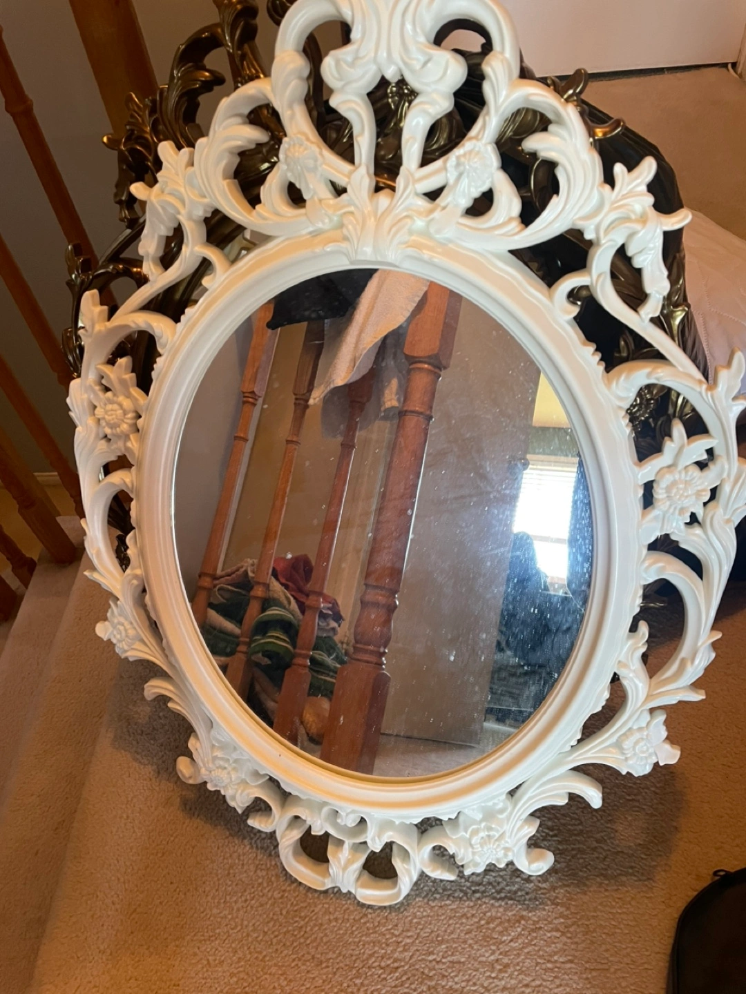 A beautiful mirror, ready to be hung. The mirror has a white ornate frame. It is oval, surrounded by intricate details, floral accents, and decorative features. This mirror would look great in a bathroom to help you relax in the mornings.
